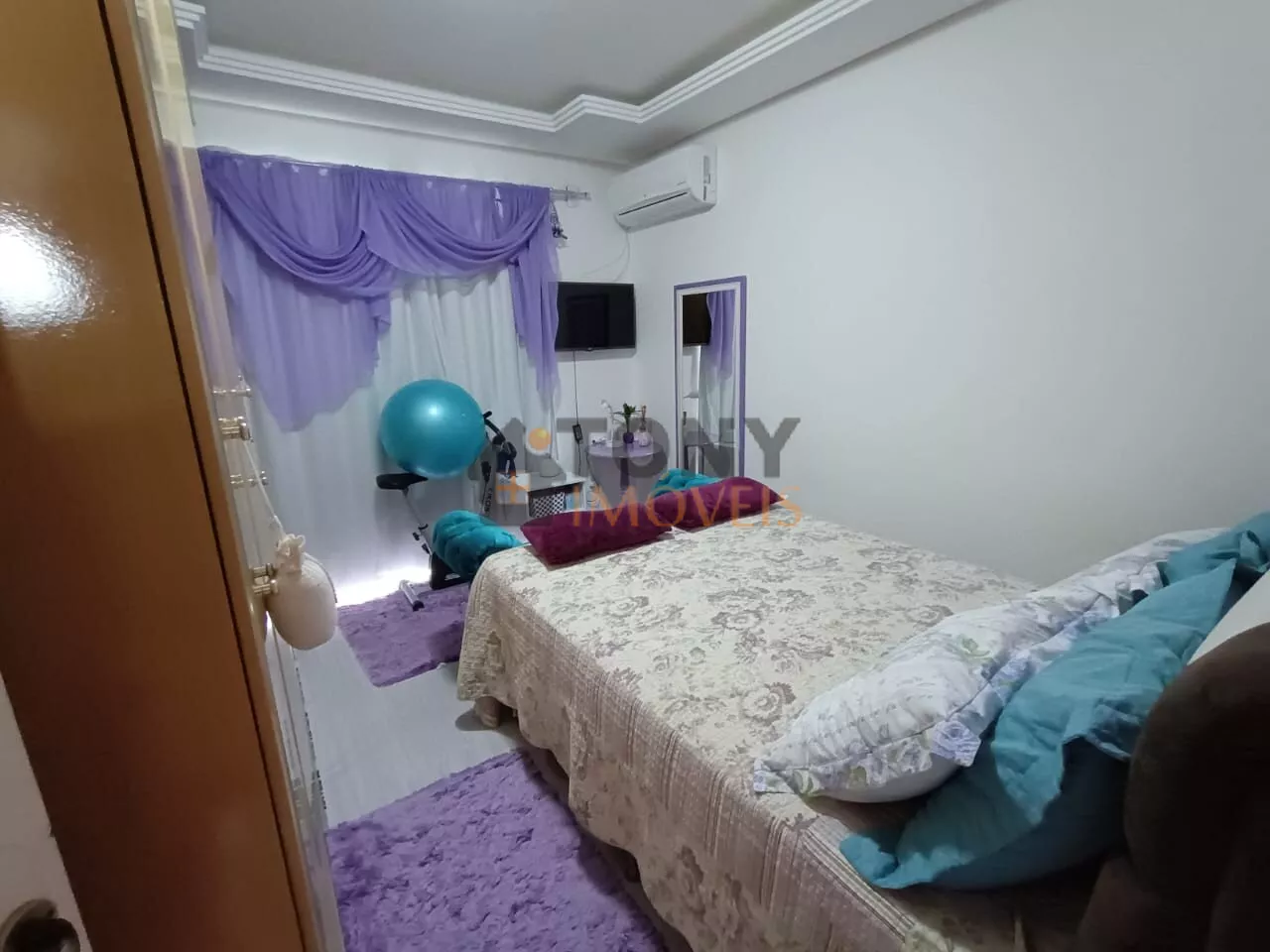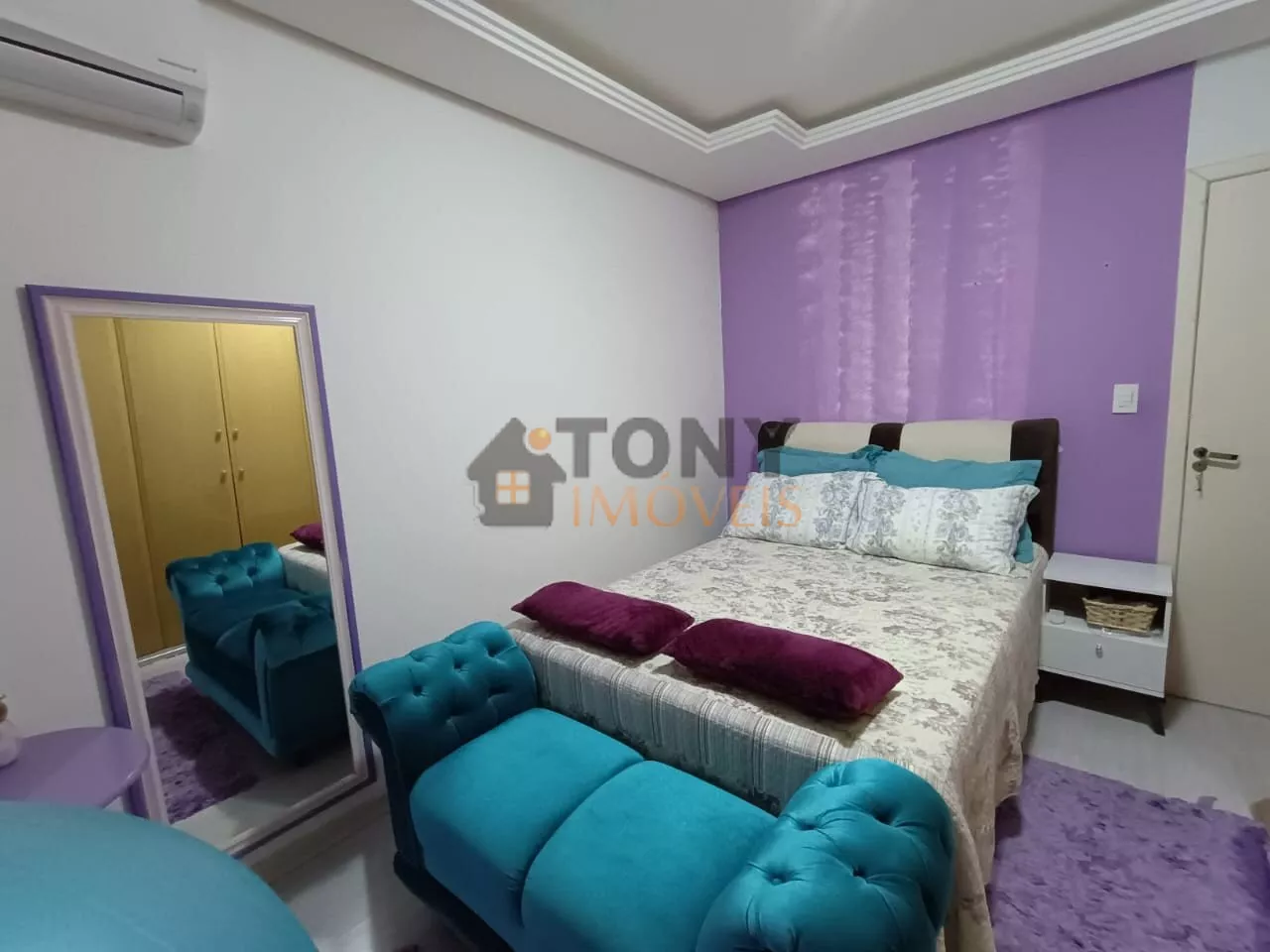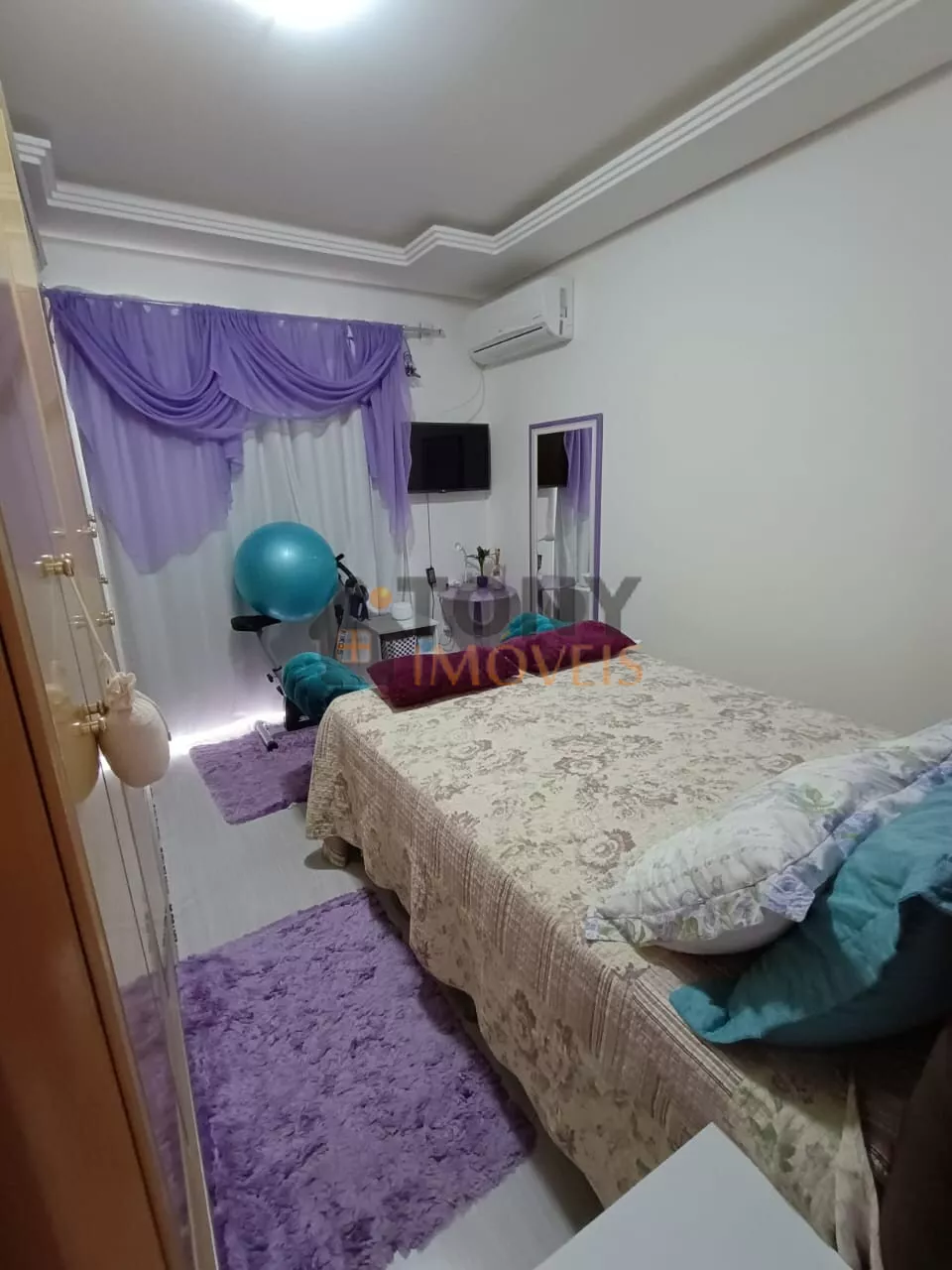 Imóvel aconchegante com acabamento em gesso no teto, sacada no quarto, luminária embutida.