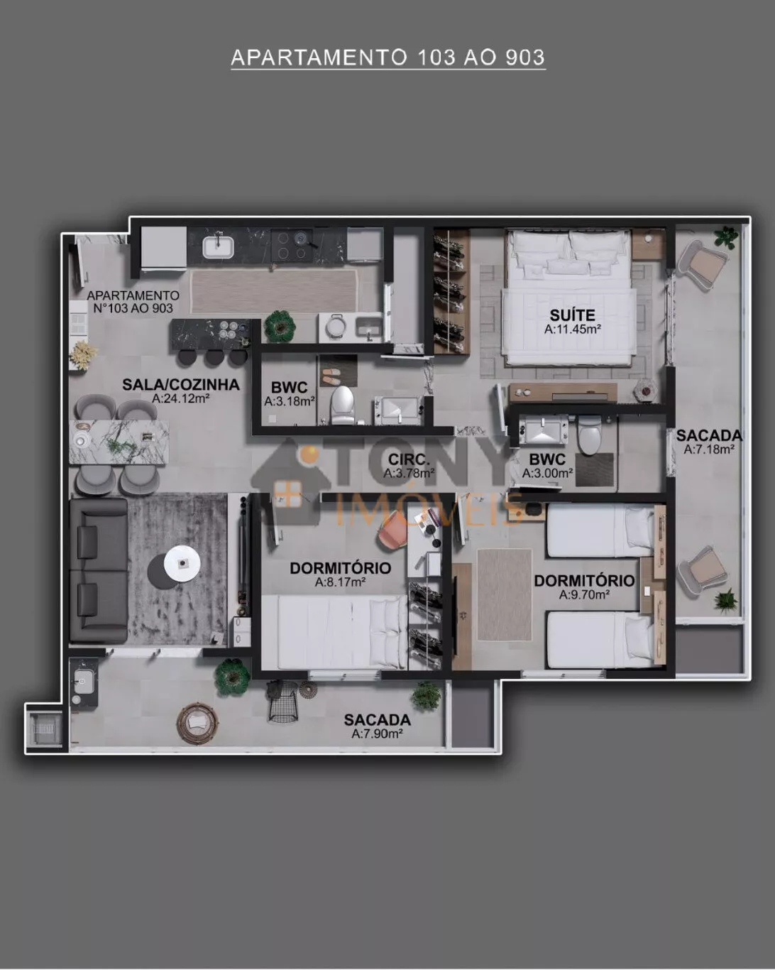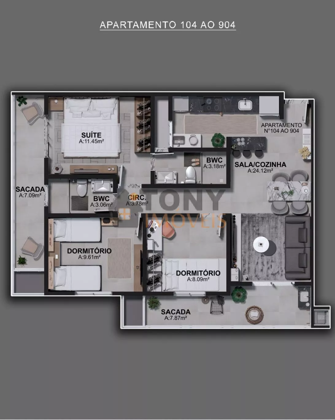 APARTAMENTO DE 3 DORMITÓRIOS COM SUÍTE E SACADA COM CHURRASQUEIRA , 2 VAGA GARAGEM , COM 91 M² PRIVATIVOS.