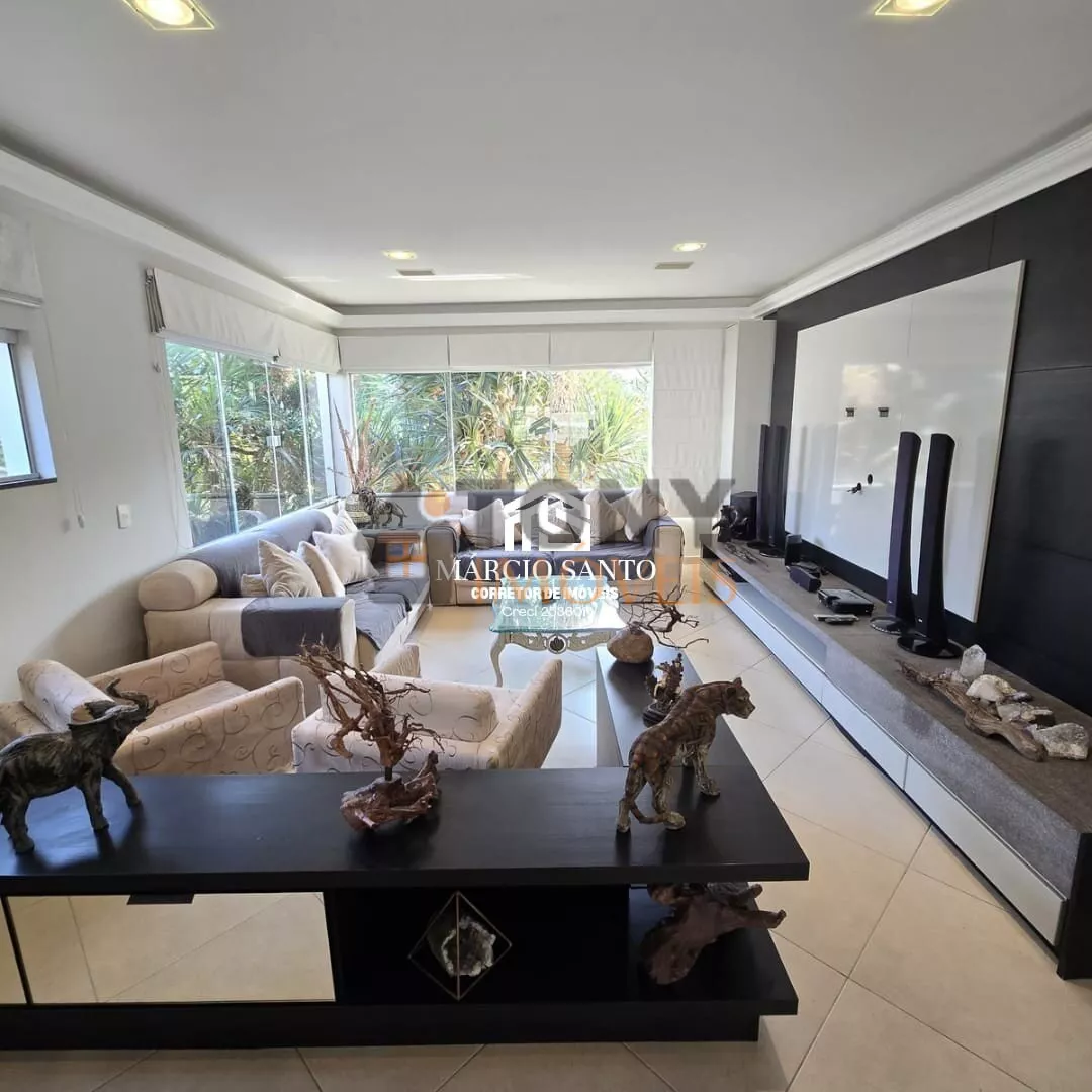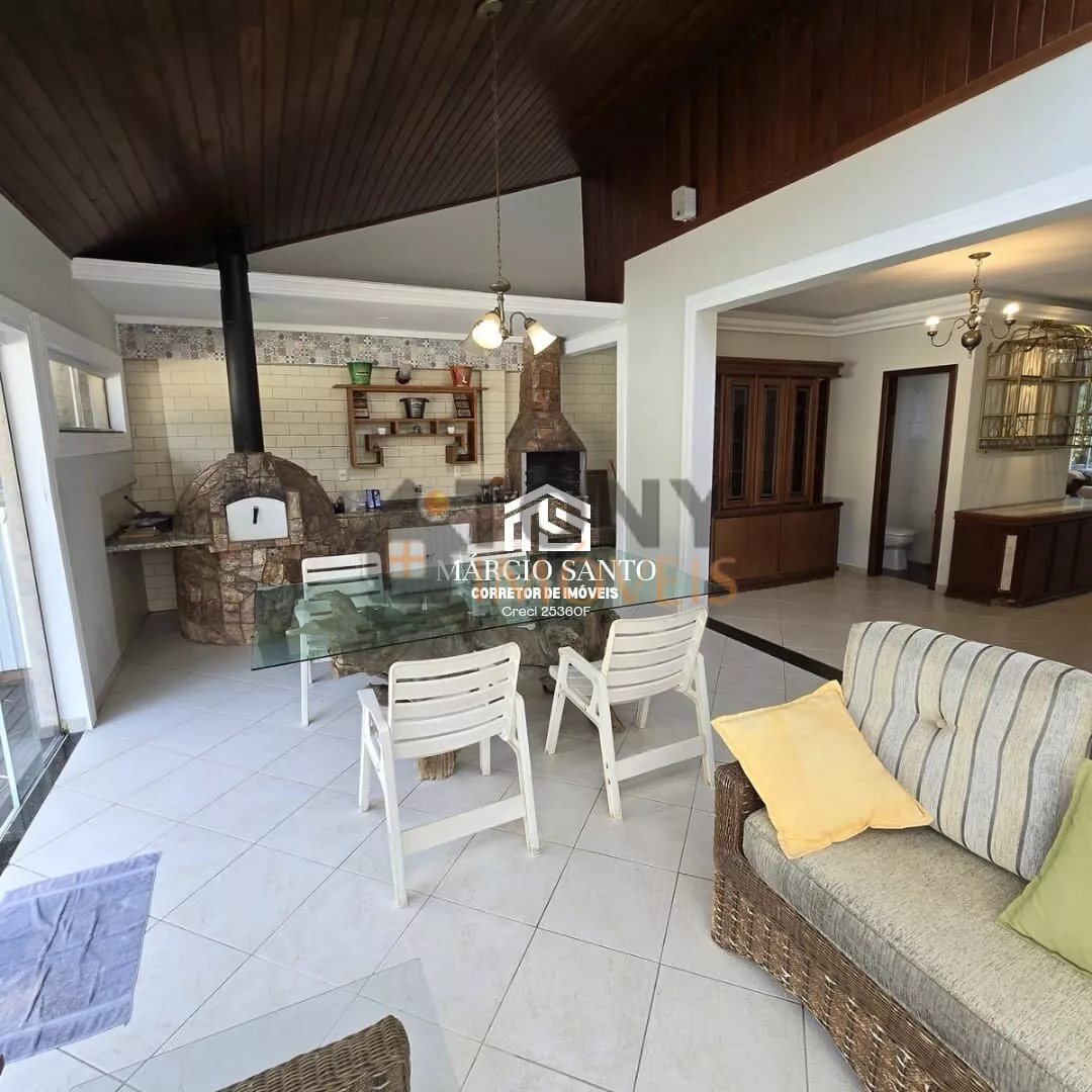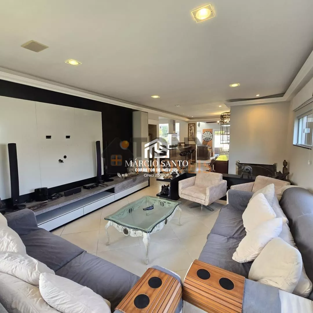 Casa residencial de alto padrão com mais de 665m², possui 5 dormitórios, sendo 4 suítes; 3 salas amplas, sendo a sala estar com lareira; varanda superior com academia e espaço lounge; varanda gourmet equipada com churrasqueira, forno de pizza e integrada ao ambiente da cozinha, sala de estar e quintal; espaço home office; cozinha planejada; 2 lavabos; edícula com dependência de empregada, banheiro de serviços, lavanderia, espaço de jogos e sauna úmida.