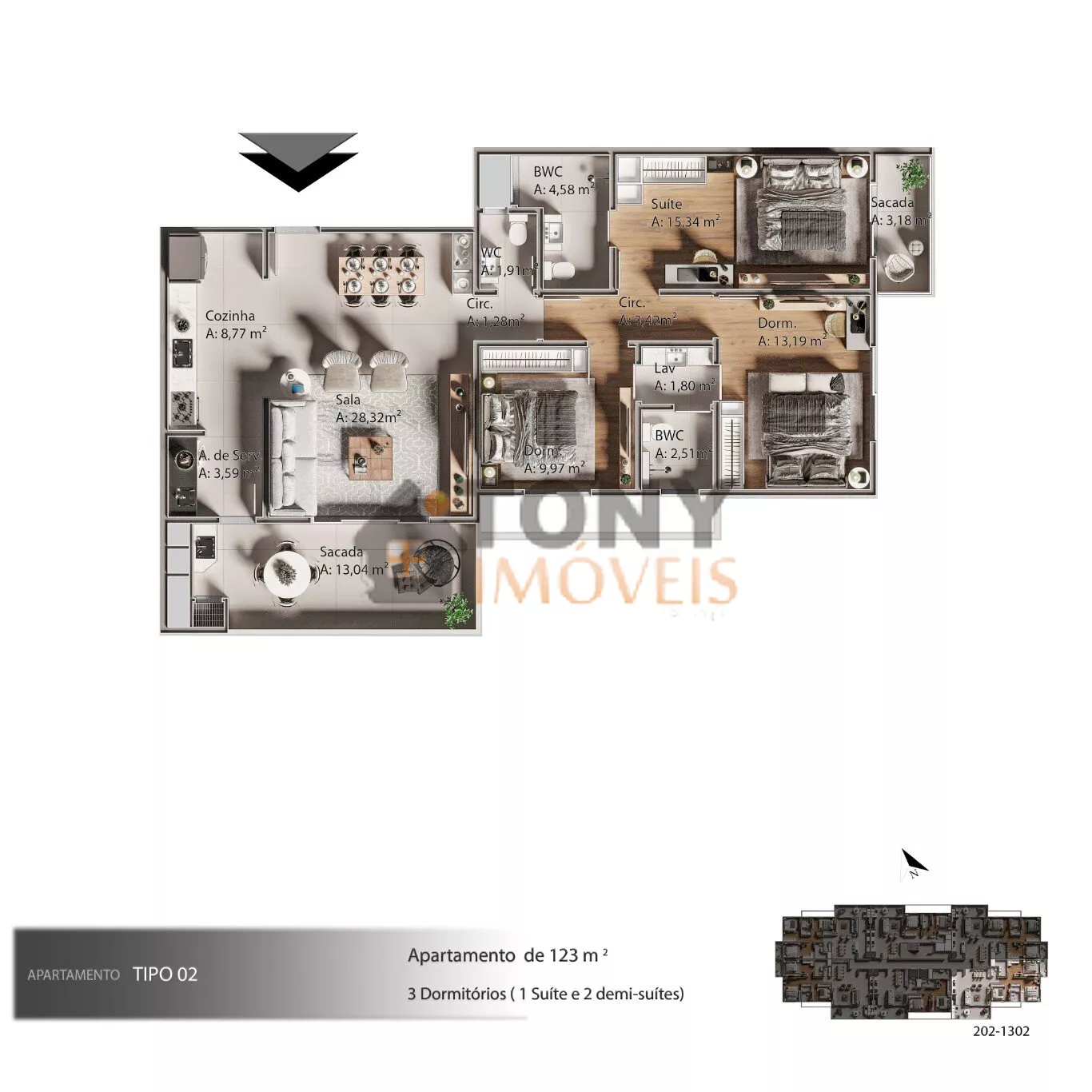 | Apartamento: | 3 DORMITÓRIOS ( 1 SUÍTE + 2 DEMI SUÍTE) | |