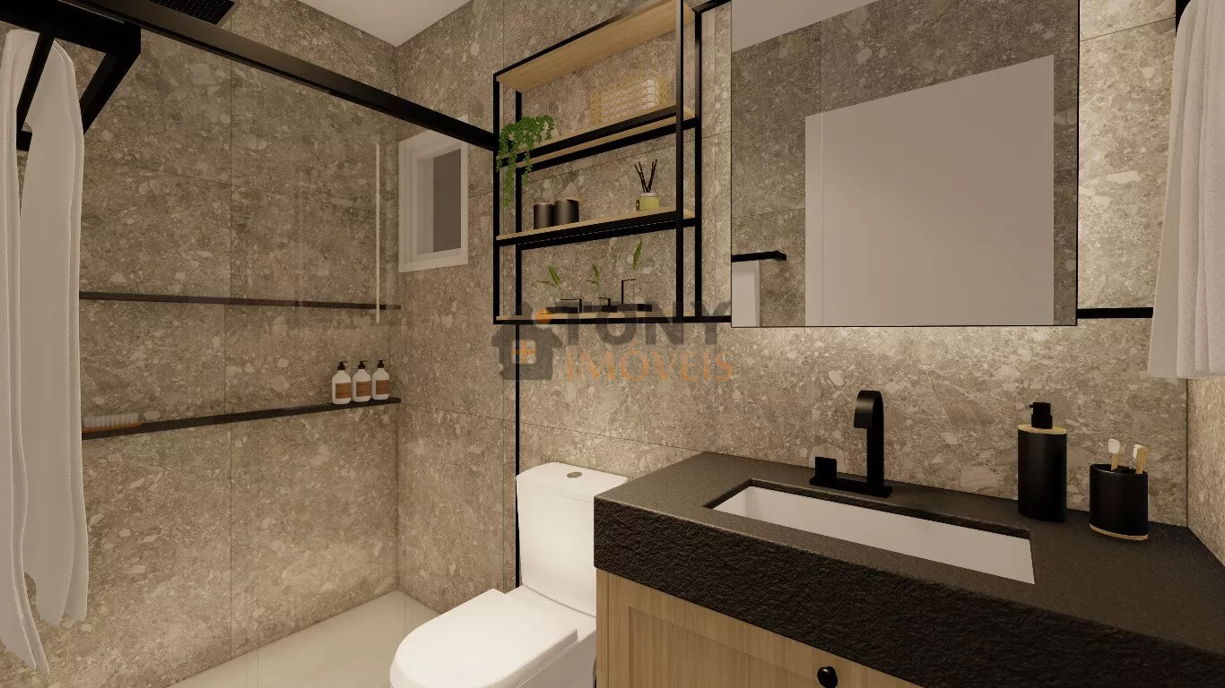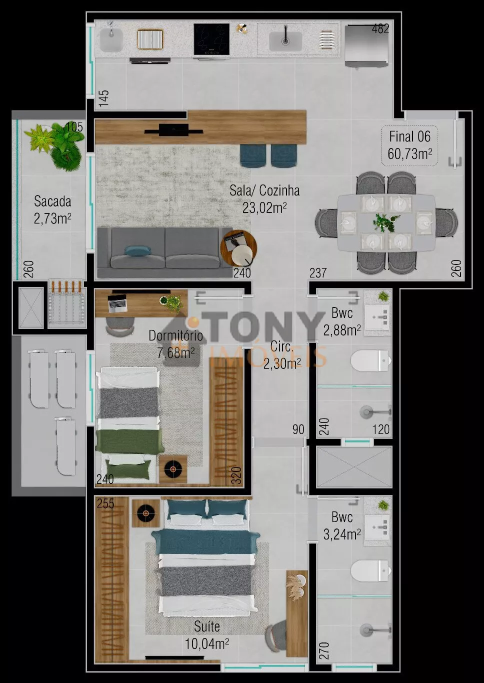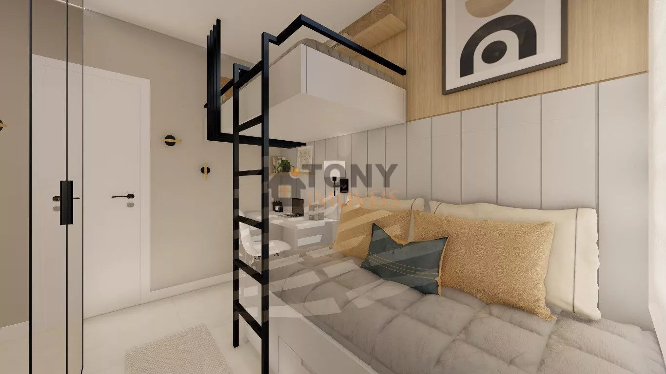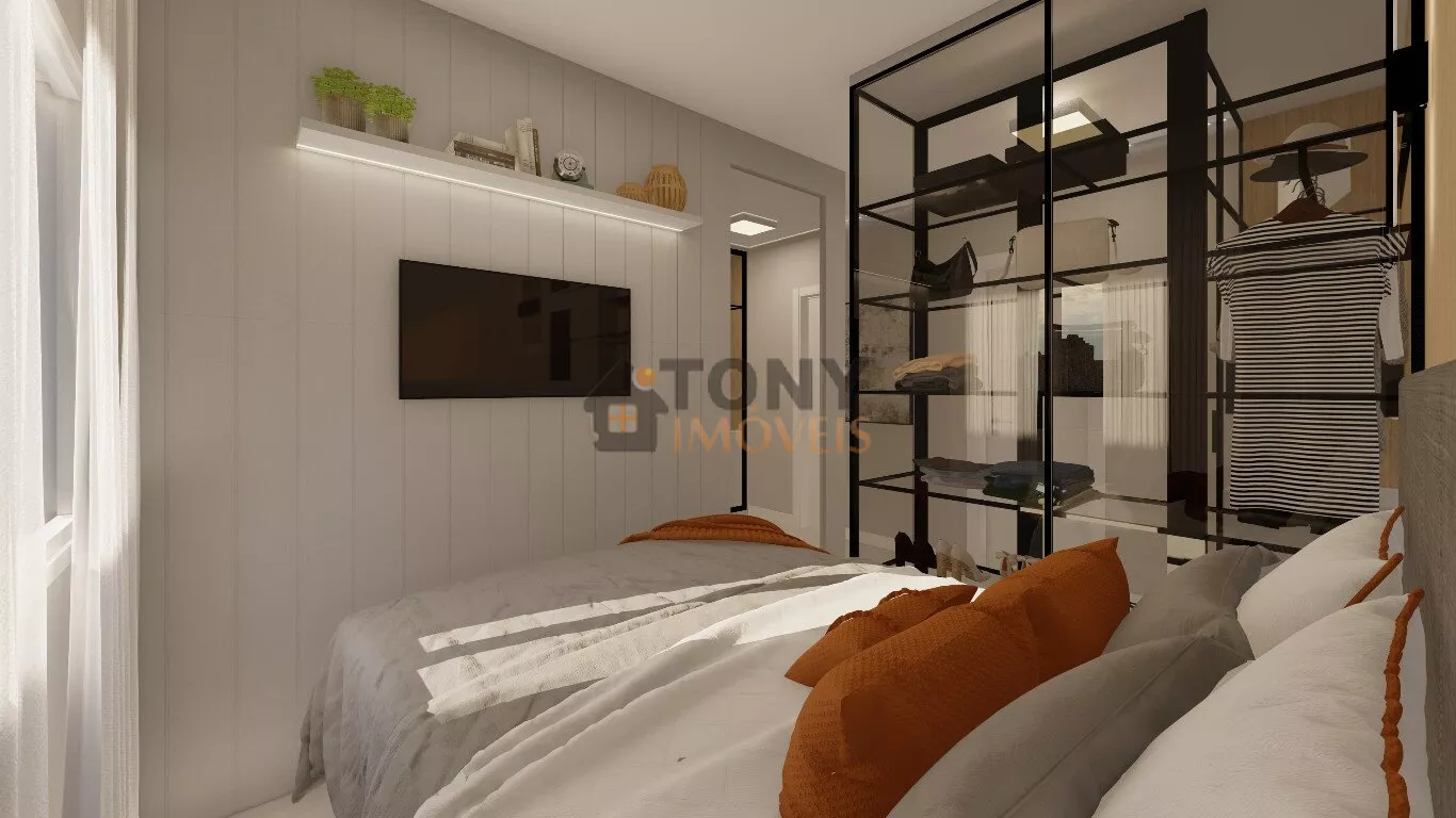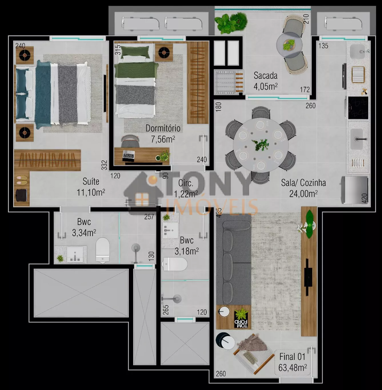 São 60m² sendo 2 quartos (1 suíte) e 1 banheiro social, churrasqueira a carvão na sacada, espera para ar condicionado, planta bem distribuída.
