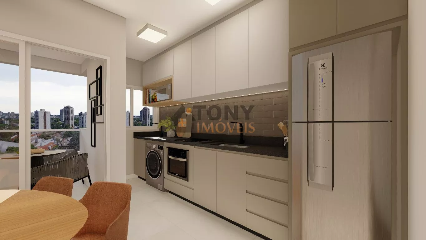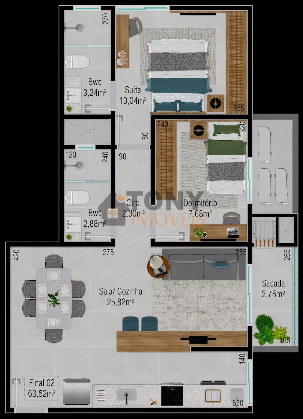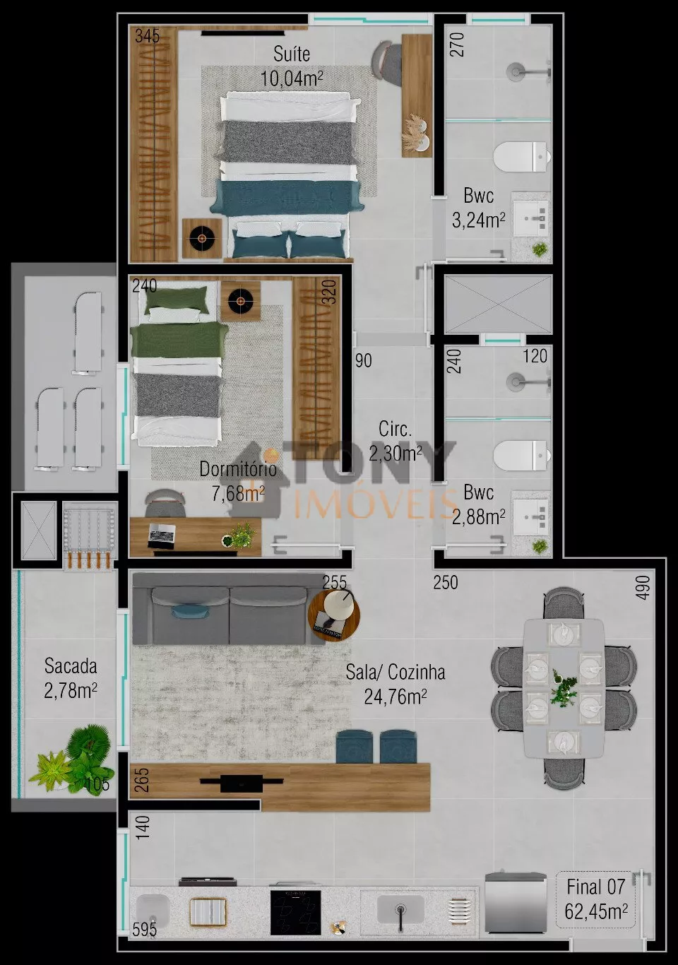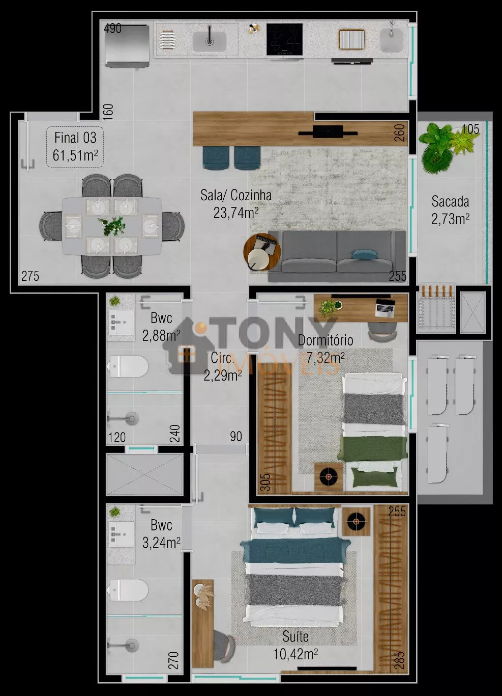 São 60m² sendo 2 quartos (1 suíte) e 1 banheiro social, churrasqueira a carvão na sacada, espera para ar condicionado, planta bem distribuída.