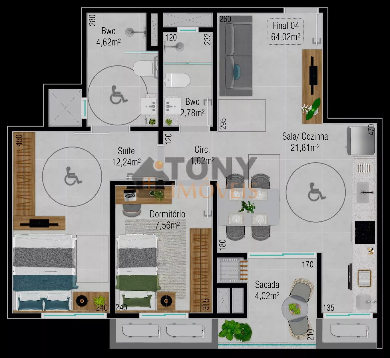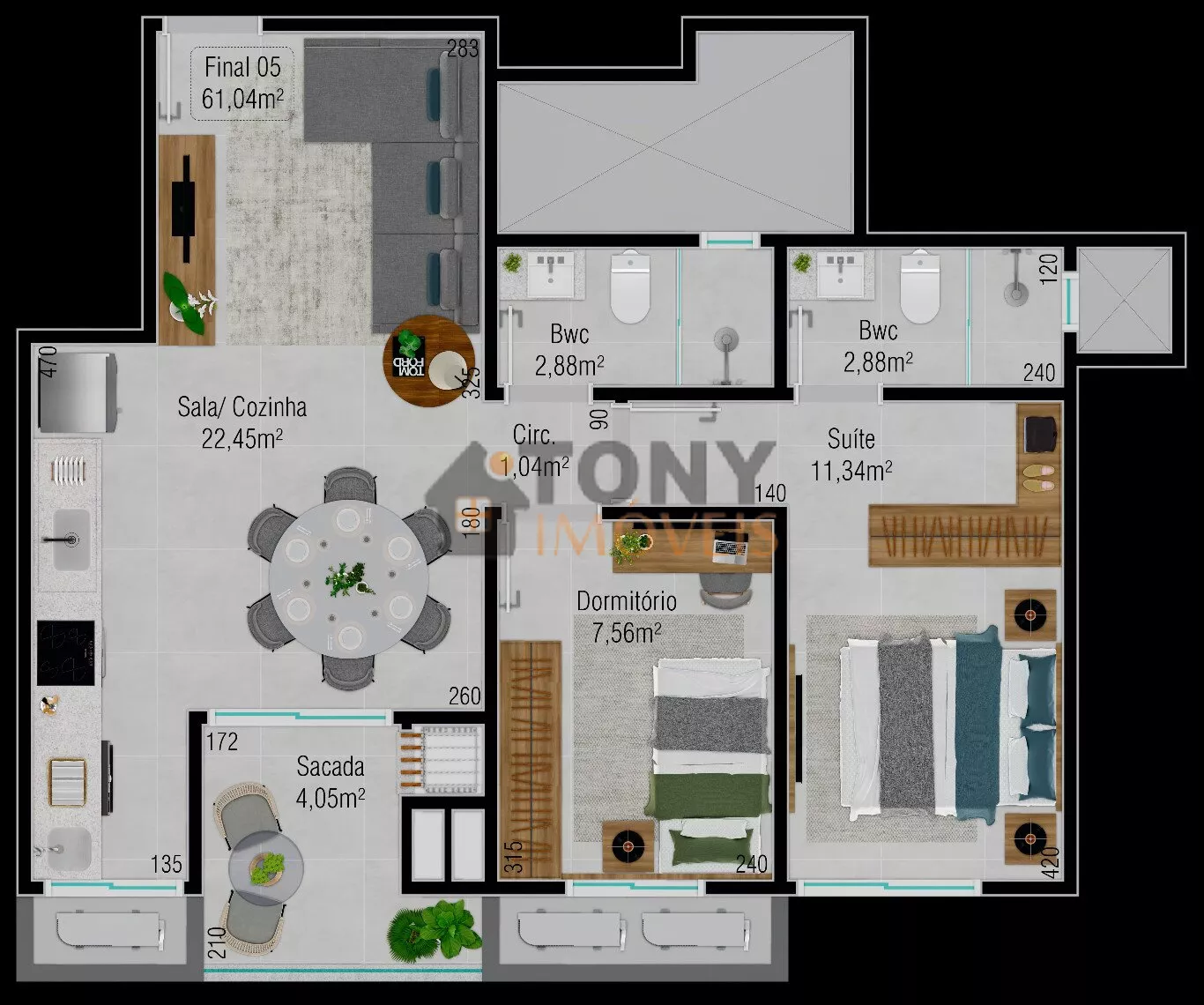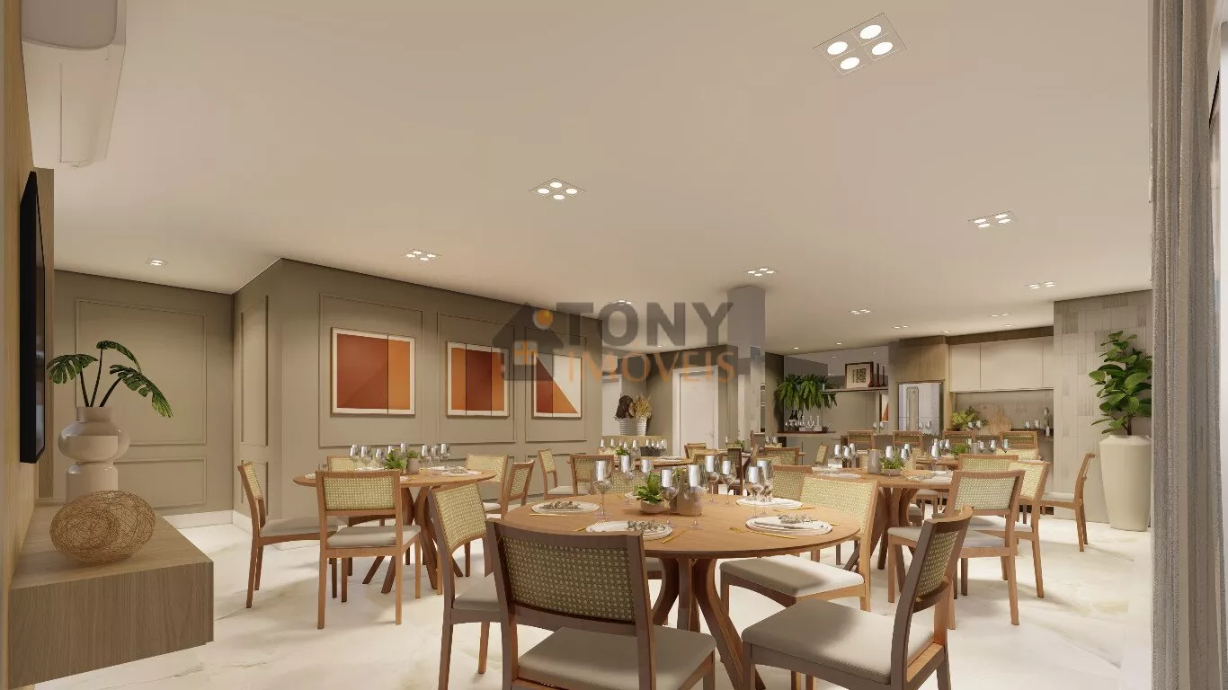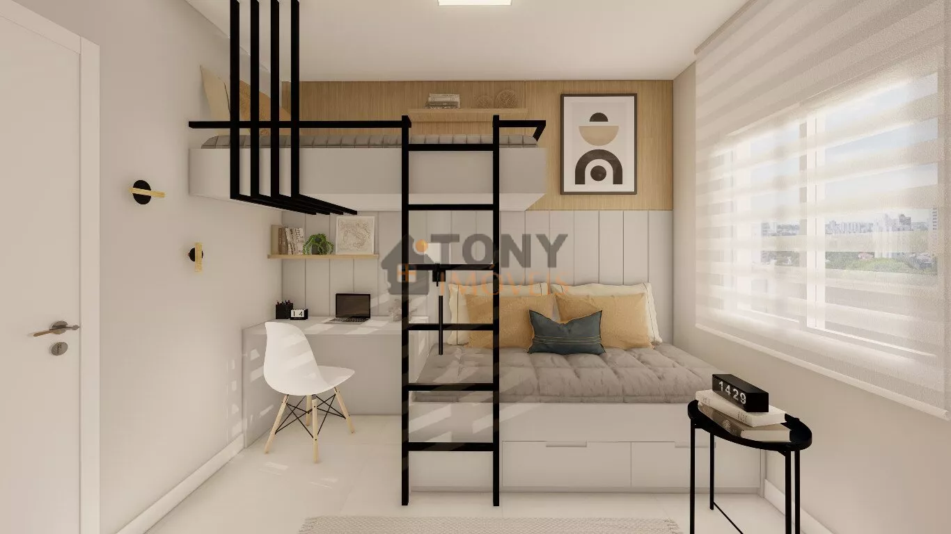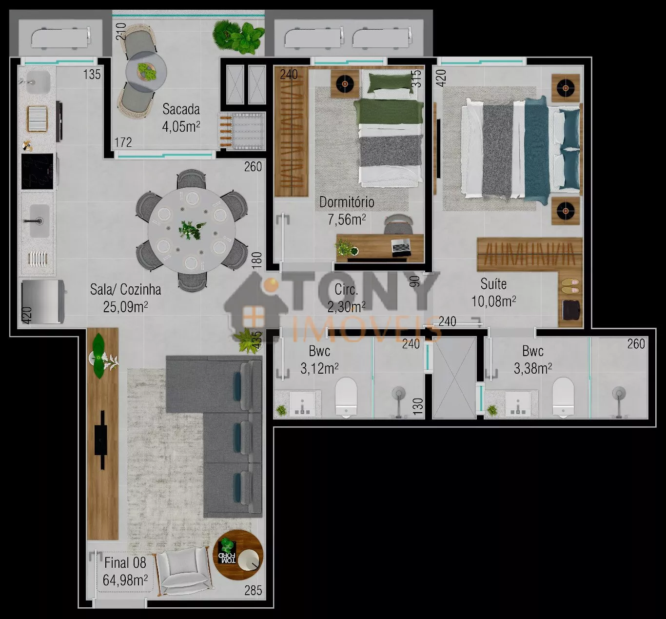 São 60m² sendo 2 quartos (1 suíte) e 1 banheiro social, churrasqueira a carvão na sacada, espera para ar condicionado, planta bem distribuída.