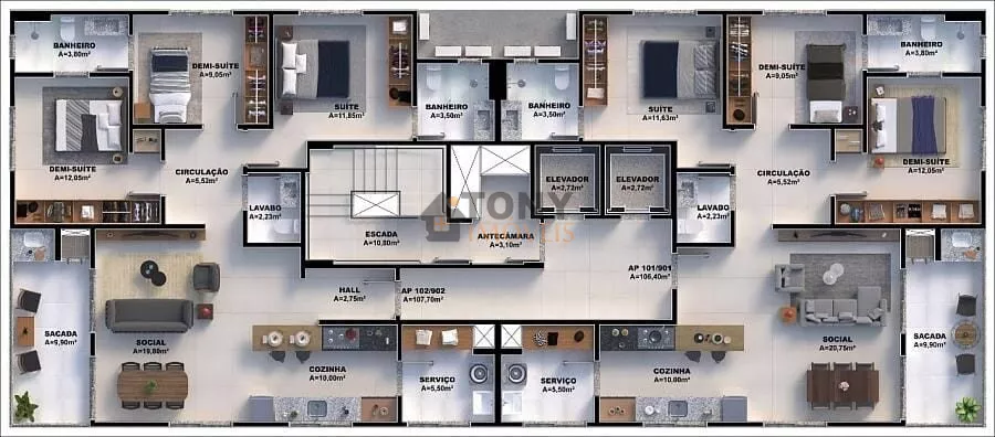 Na área íntima possibilita a criação de um home office ou armários de uso coletivo na circulação e todos os banheiros possuem ventilação natural. Para dar apoio ainda disponibiliza um lavabo.