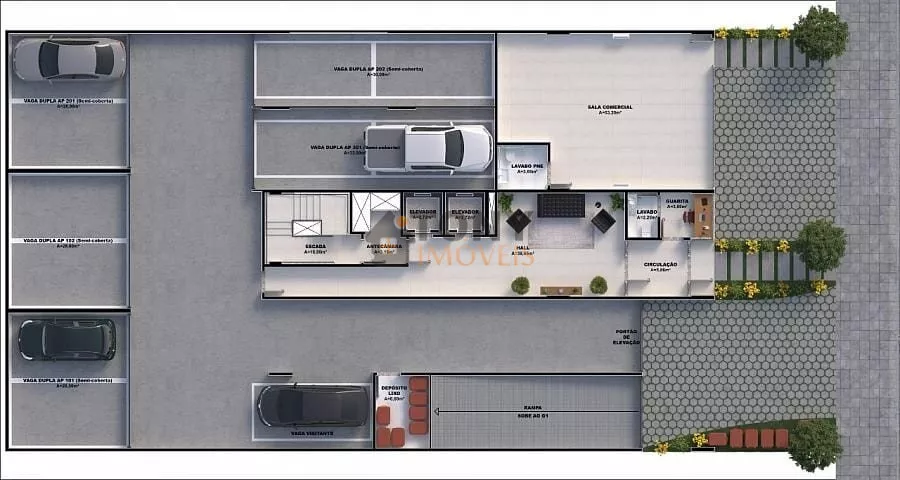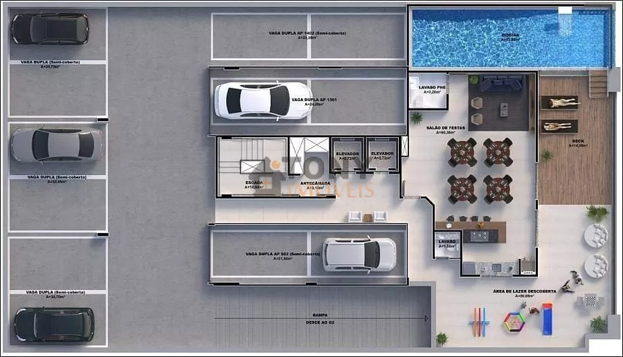 A unidade acompanha duas vagas, sendo uma vaga dupla coberta.