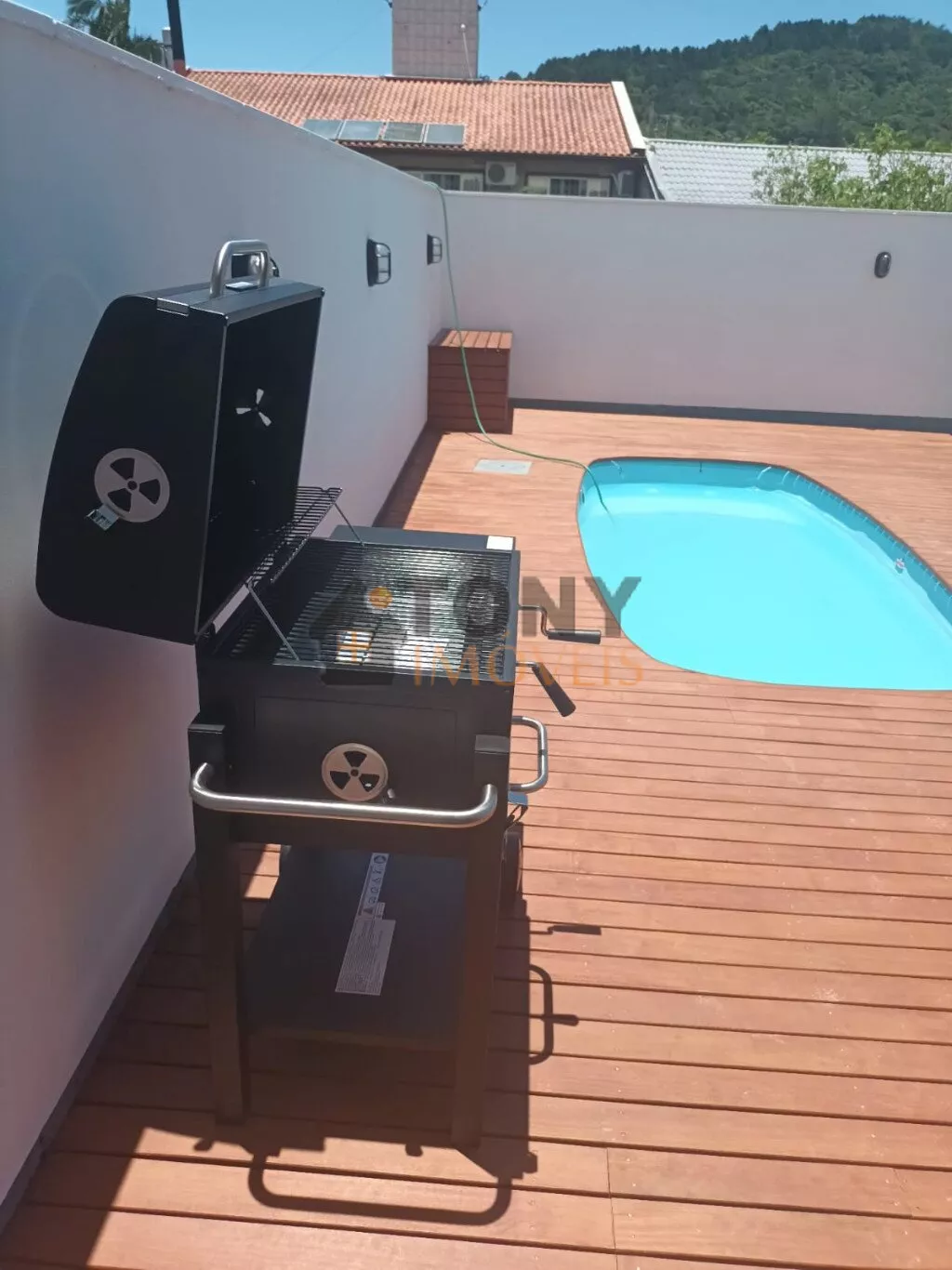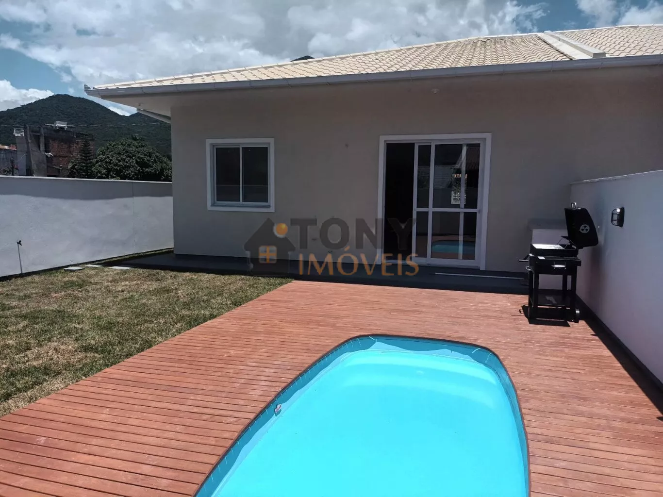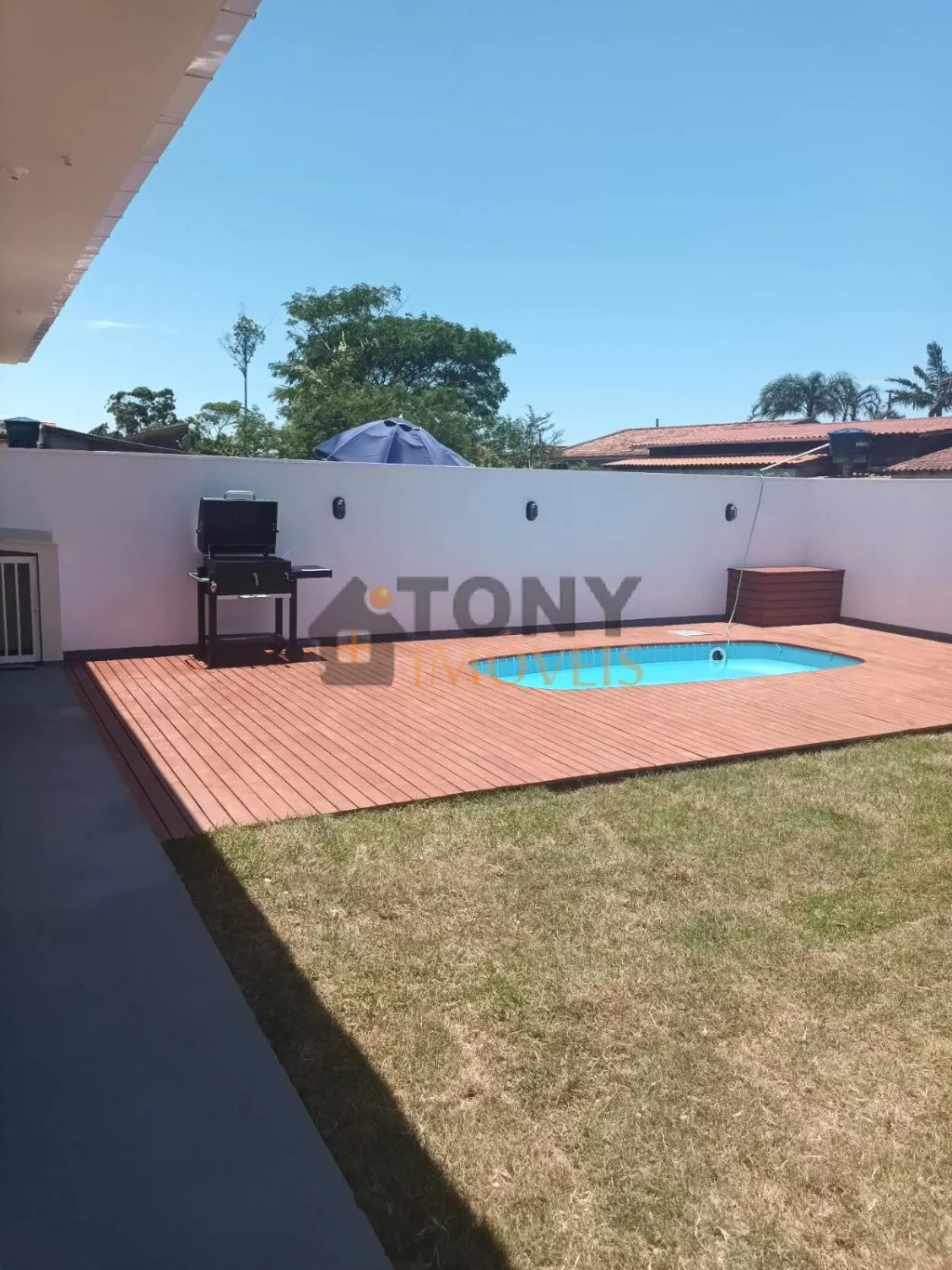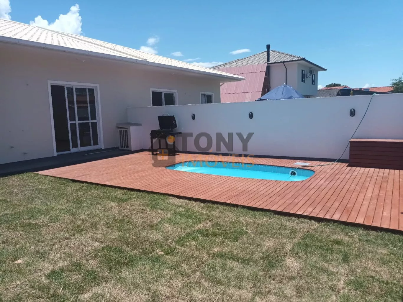 O banheiro social também conta com box e pia esculpida, mantendo o padrão de qualidade da casa. O pé direito de 3 metros proporciona uma sensação de amplitude e conforto. No exterior, a piscina de 4x1,4m de profundidade, equipada com motor e filtro, é ideal para os dias quentes. A churrasqueira móvel é perfeita para reunir amigos e familiares.
