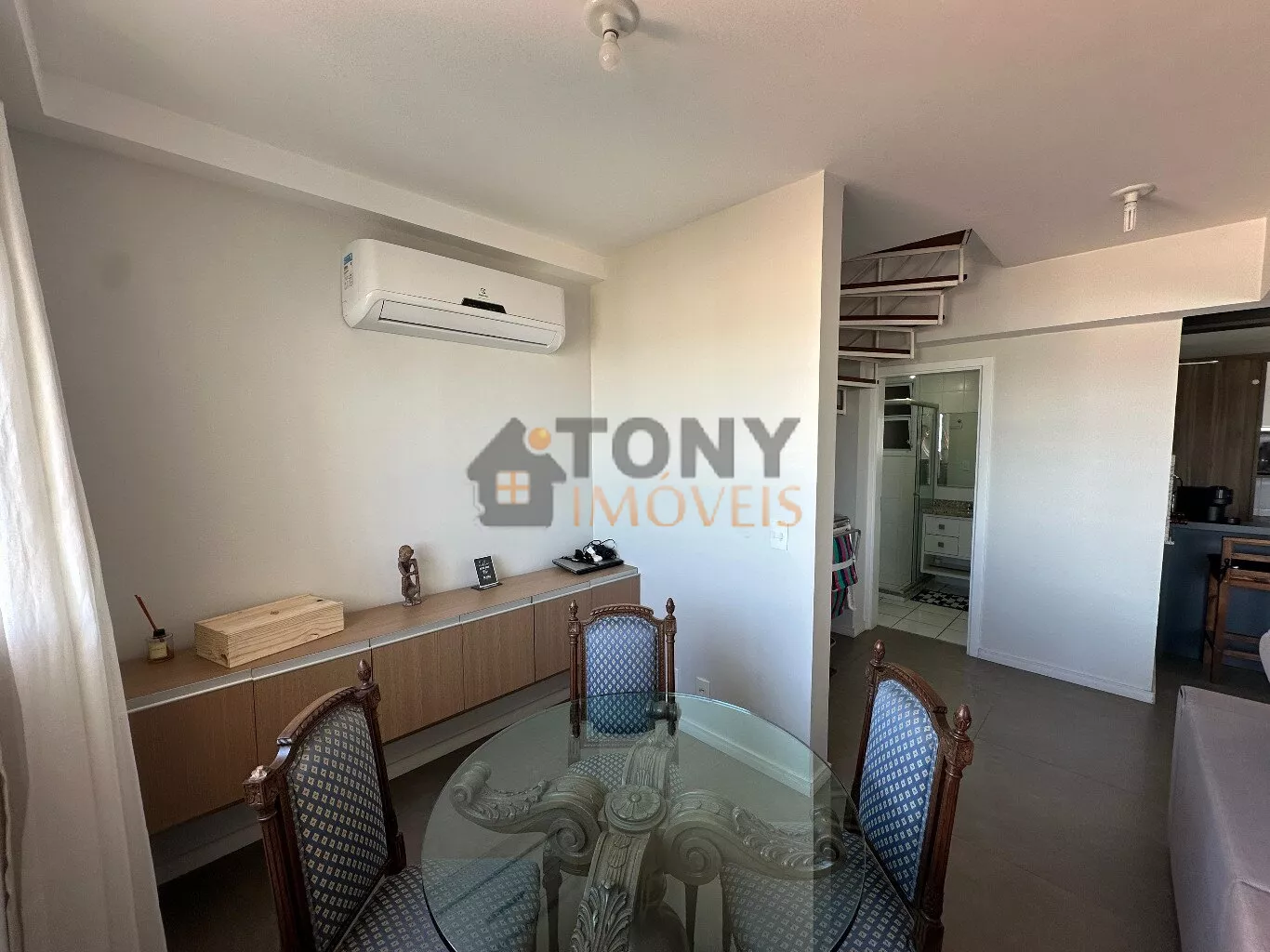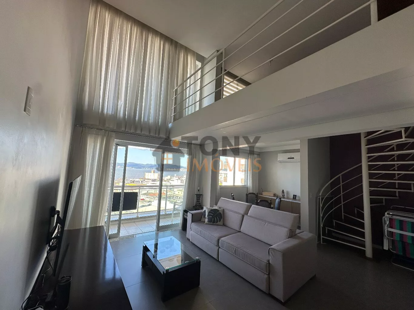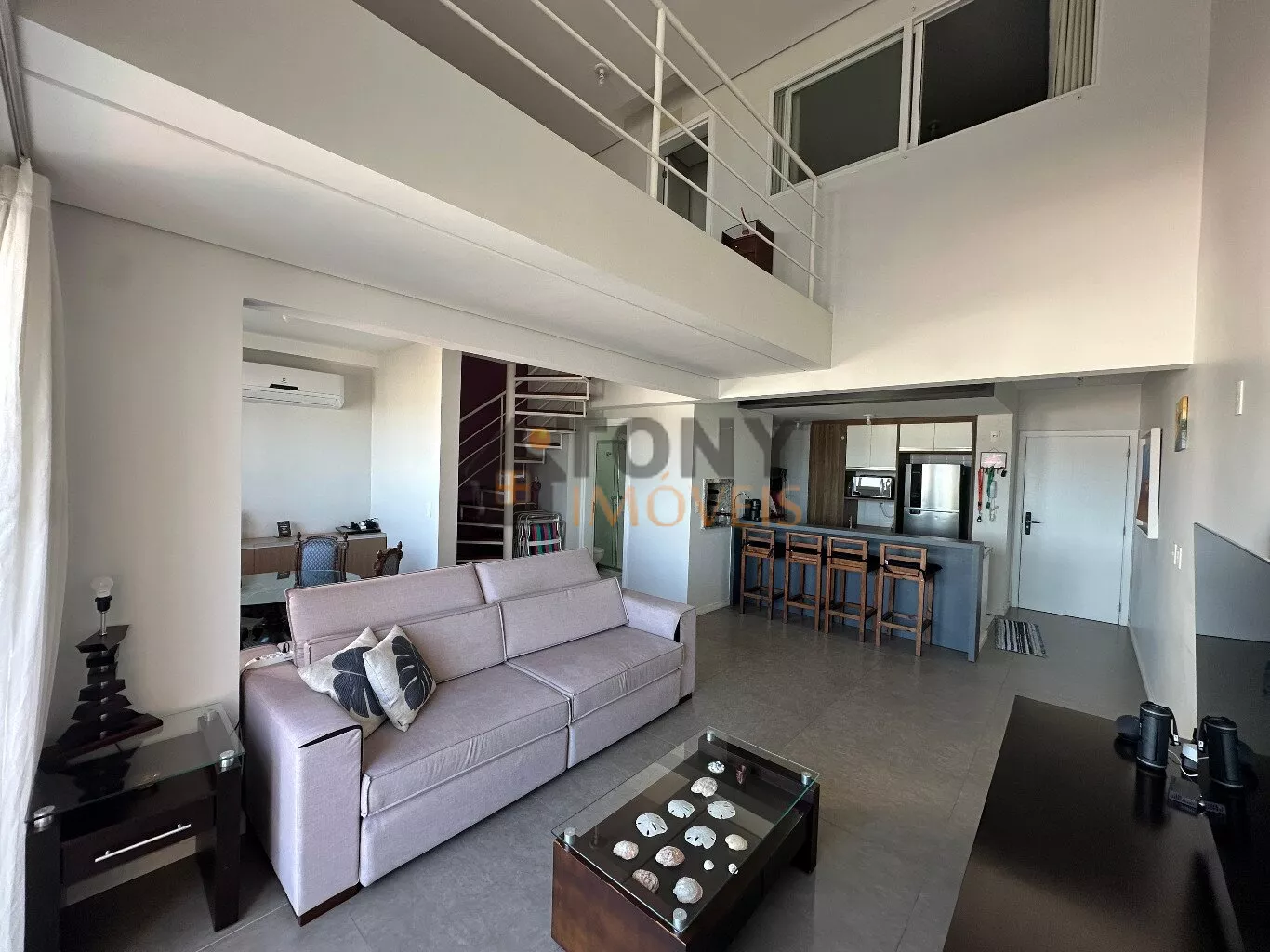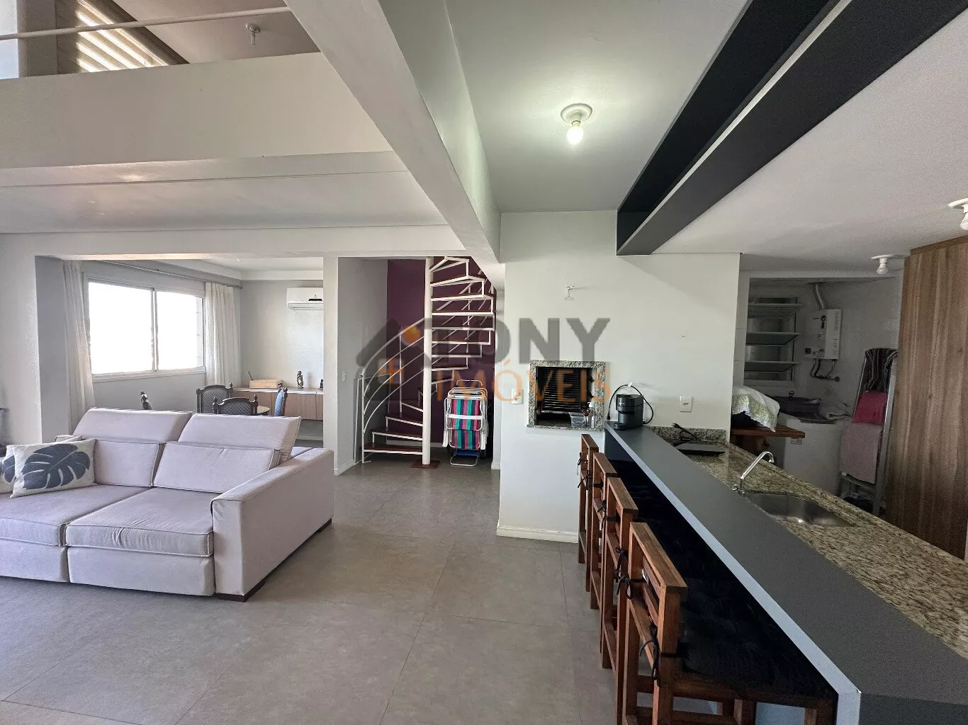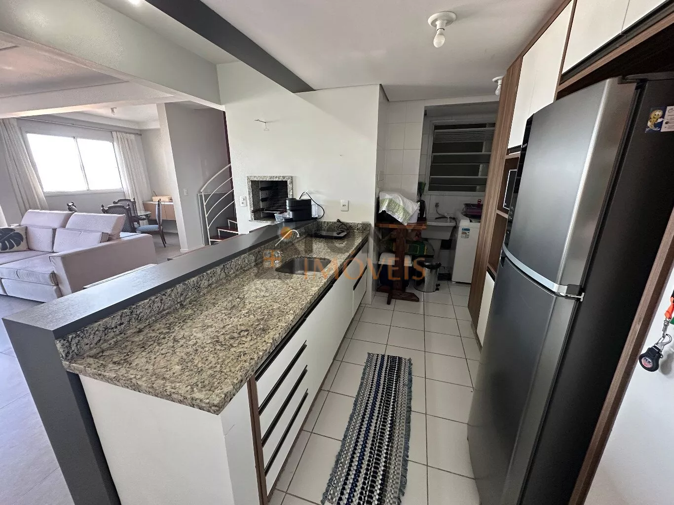 São 100m² privativos distribuídos em um andar com duas grandes salas que já possuem vista mar, uma cozinha espaçosa com churrasqueira e área de serviço, banheiro social além da sacada principal com uma vista mar incrível e a escada para o andar superior que tem uma sala particular junta a suíte.