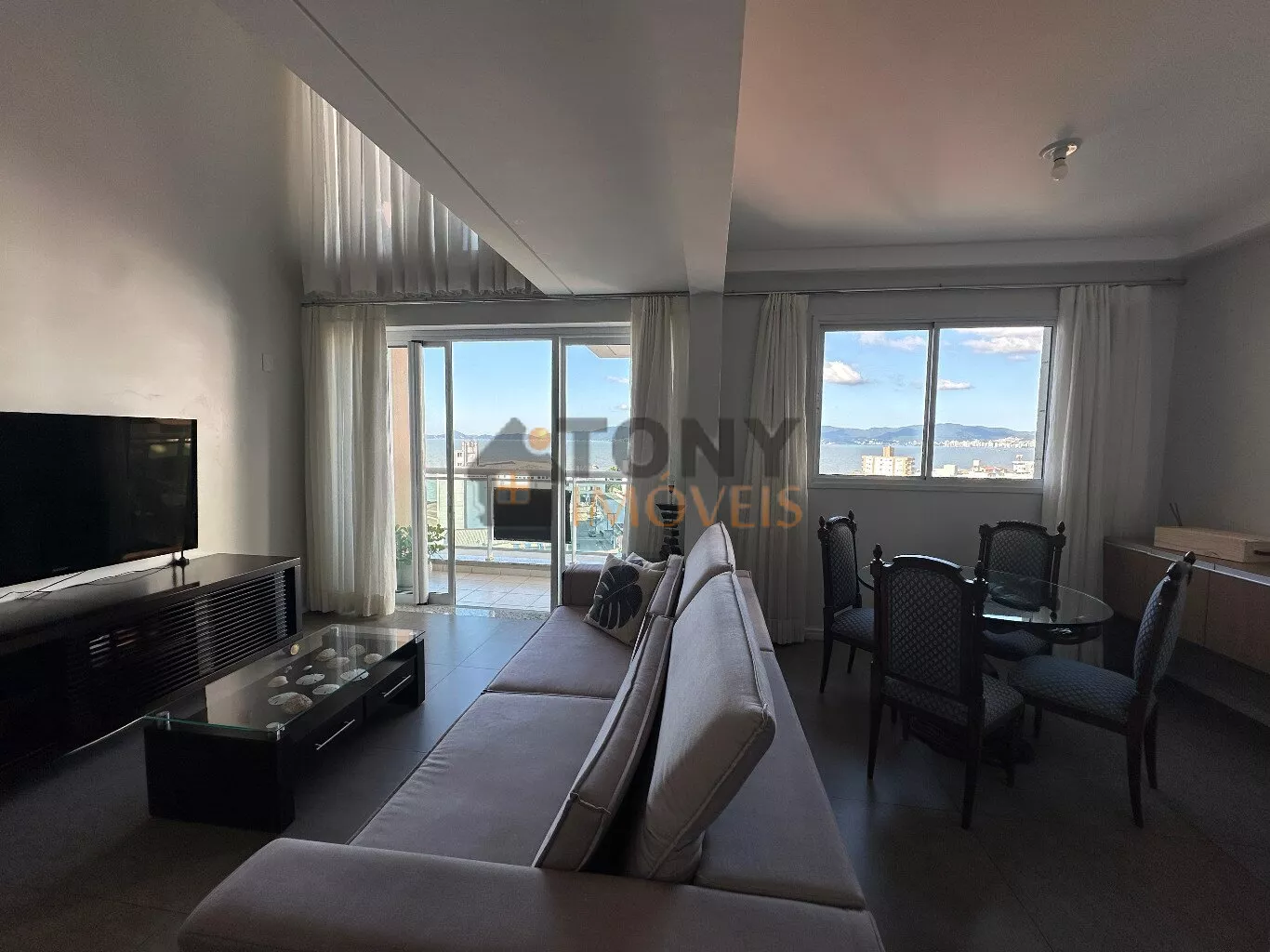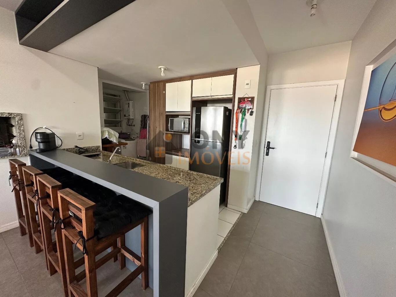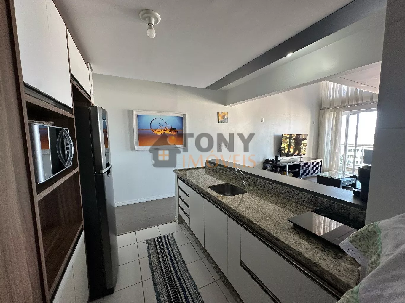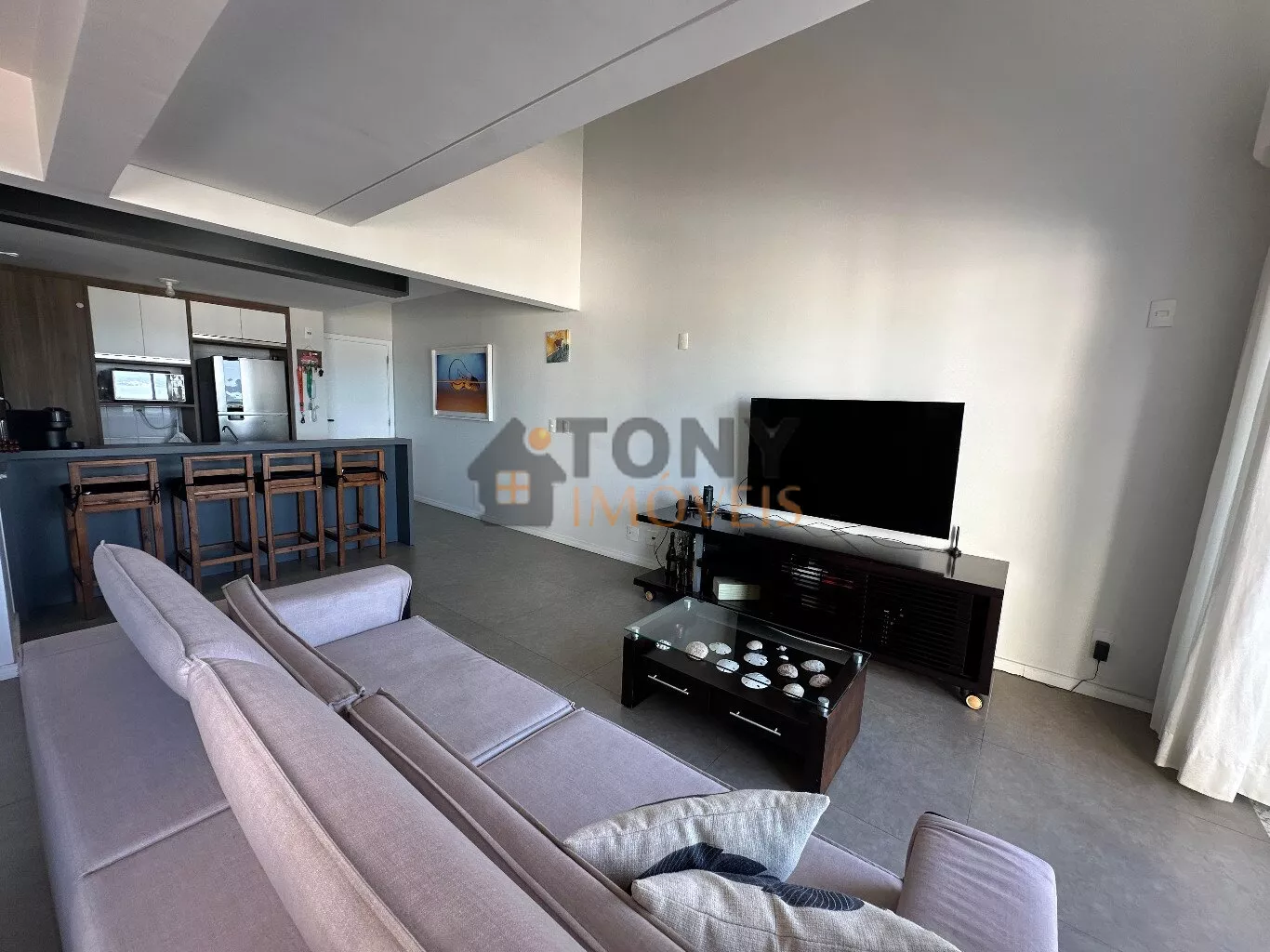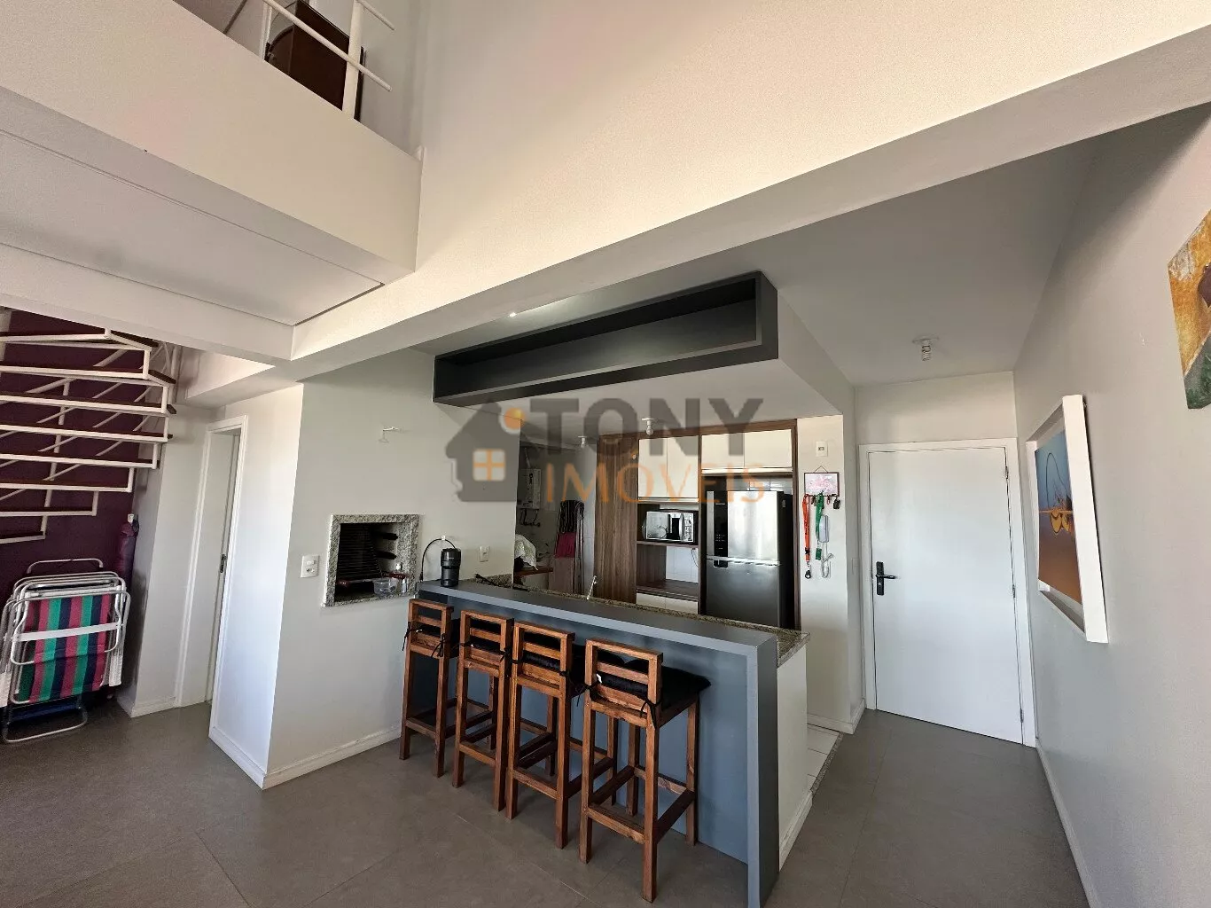 São 100m² privativos distribuídos em um andar com duas grandes salas que já possuem vista mar, uma cozinha espaçosa com churrasqueira e área de serviço, banheiro social além da sacada principal com uma vista mar incrível e a escada para o andar superior que tem uma sala particular junta a suíte.