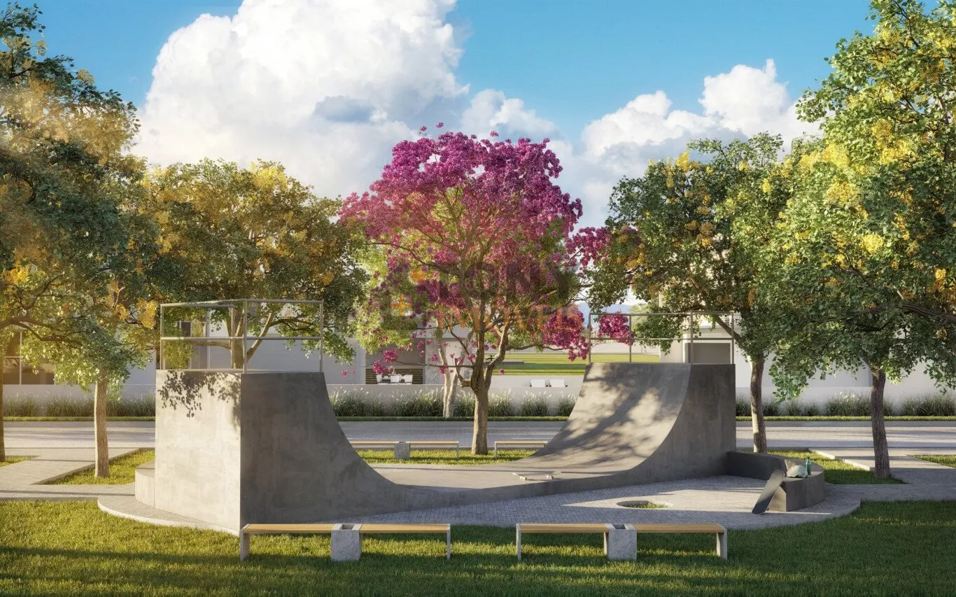 Lagos contemplativos; Praças com pergolados; Playground; Pista de skate; Quadra de areia; Espaço Pet