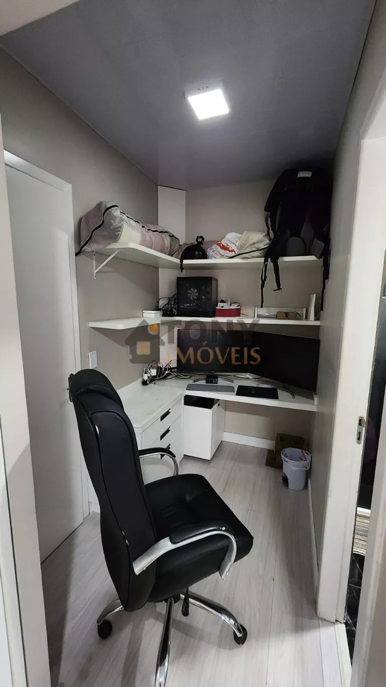 -Mini Escritório climatizado com duas prateleiras grandes e bancada tudo em formato L