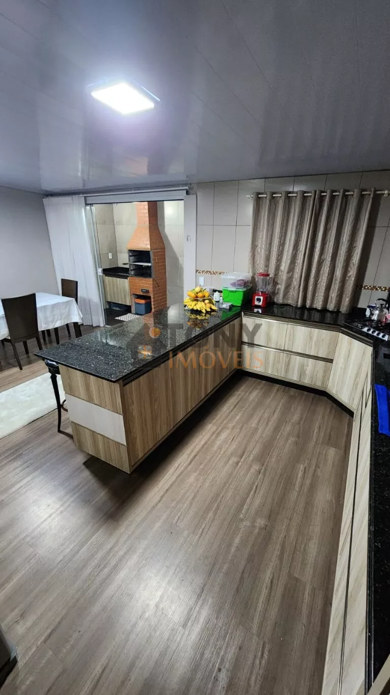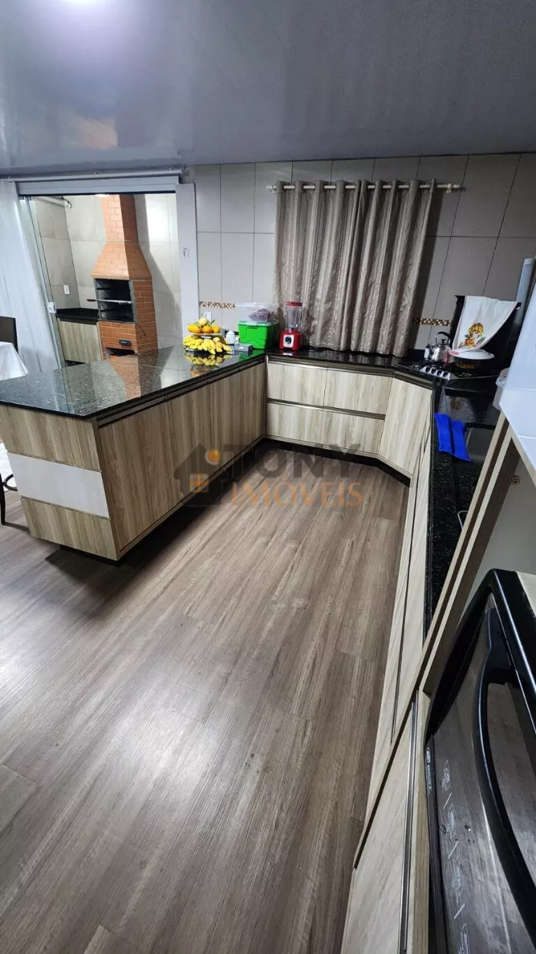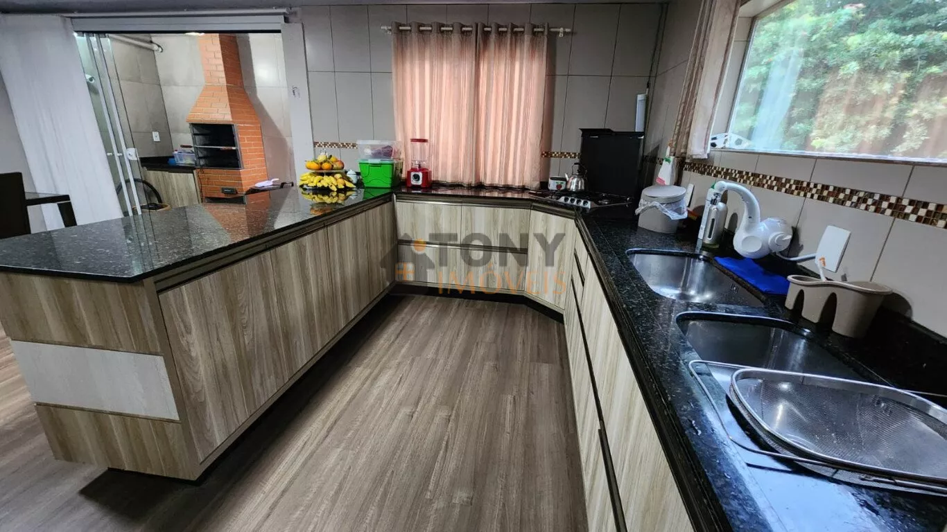 -Ampla cozinha com mais de 5 metros de pedra, tudo com armário embutido, inclusive o fogão dentro da pedra e com duas cubas grandes industrial, ar condicionado 18000btus e Torneira Elétrica