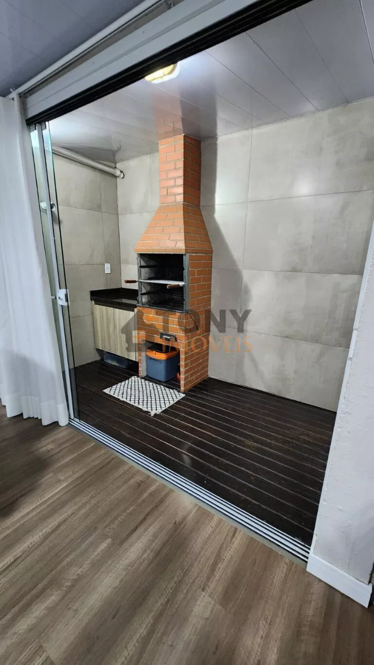 -Área de churrasqueira climatizada com bancada do lado e duas portas de armário