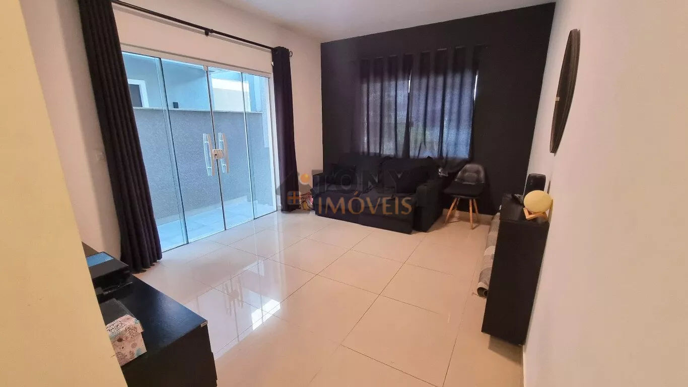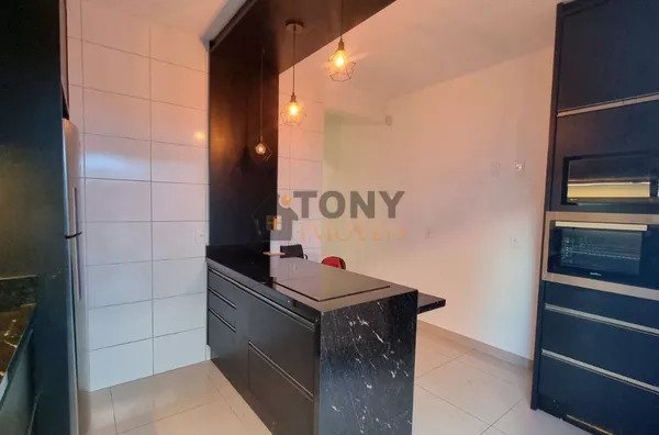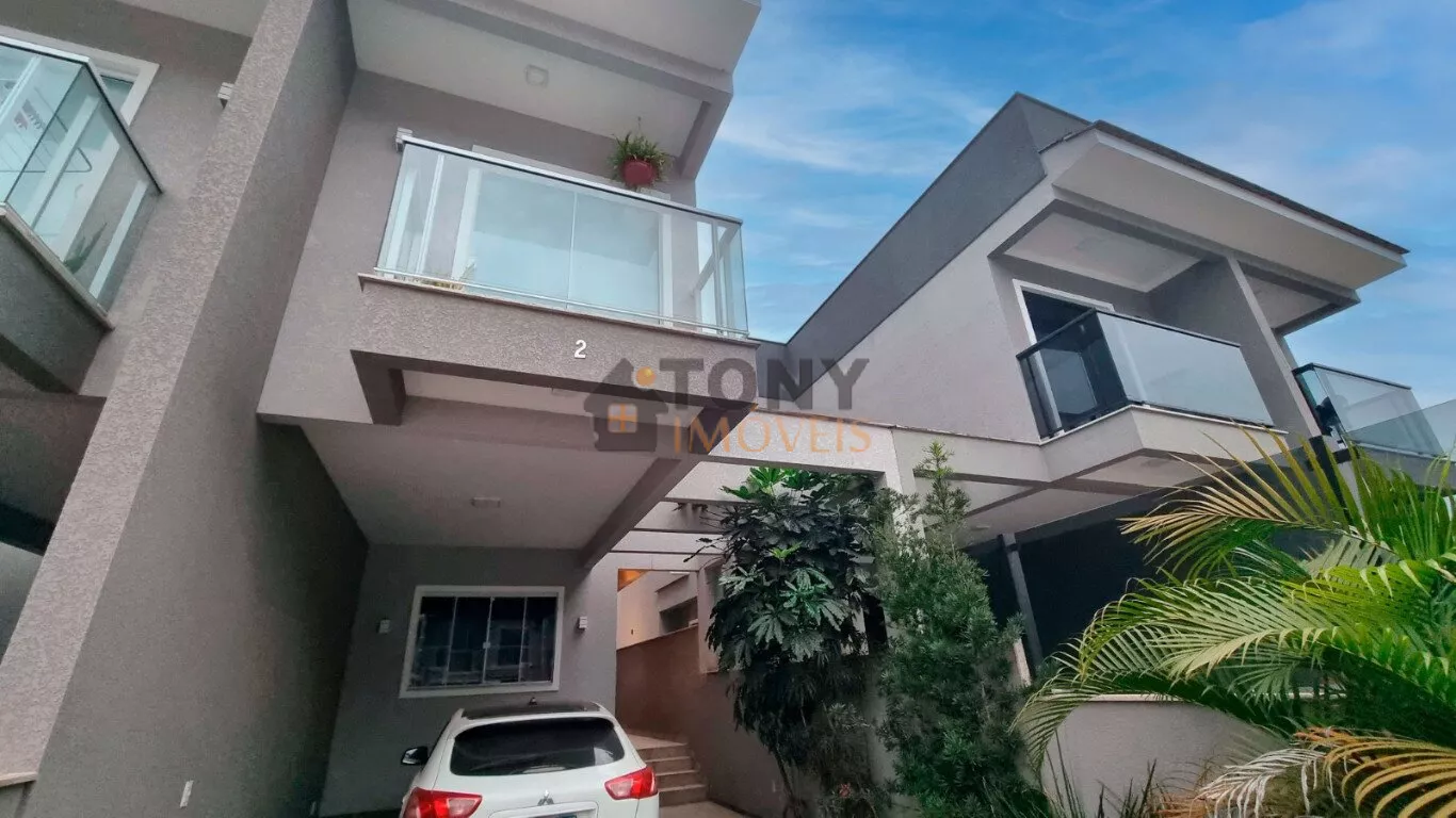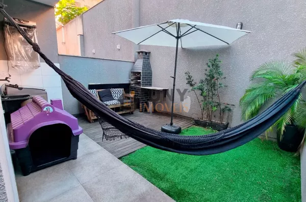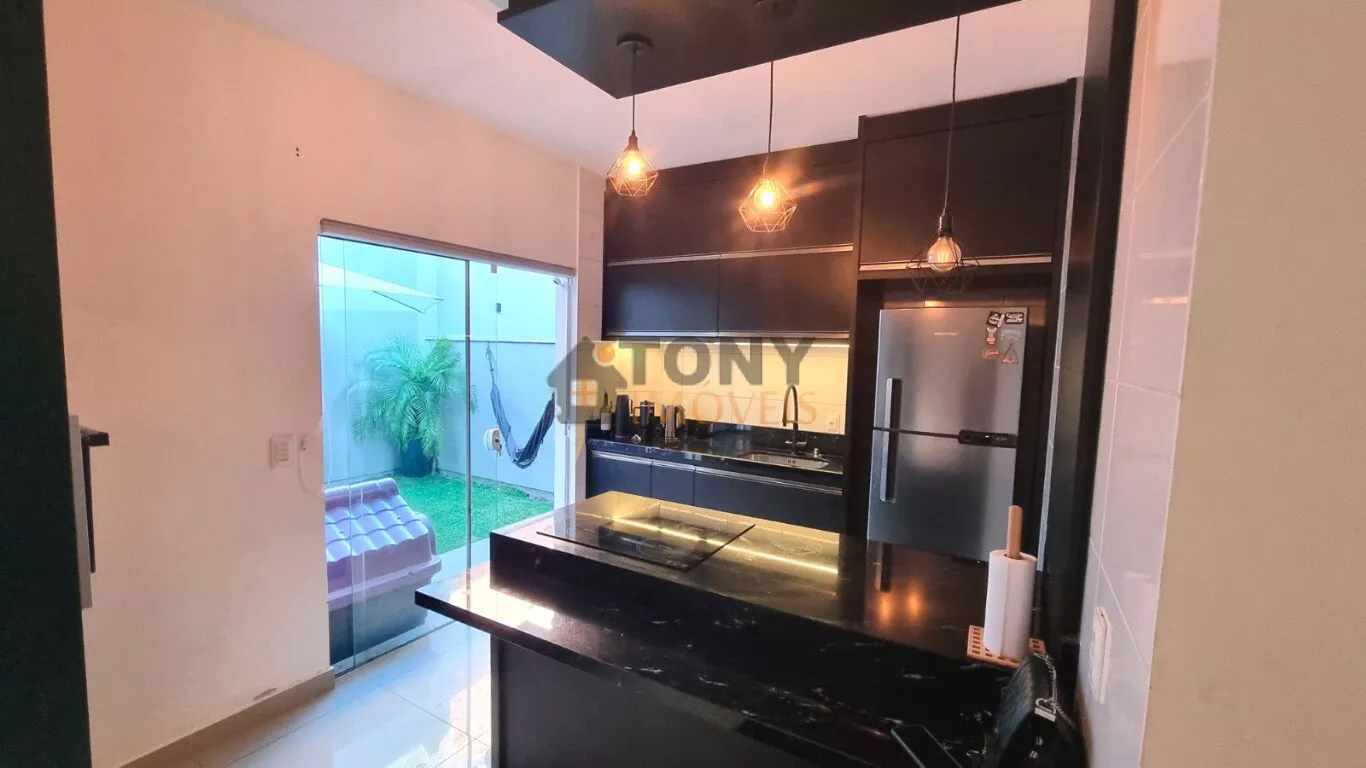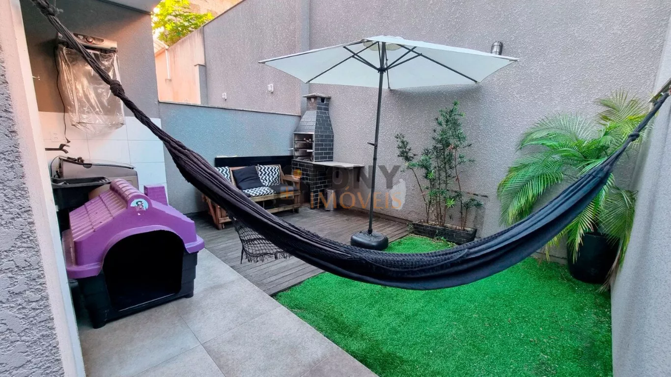 Um sobrado com 3 quartos, 2 banheiros, espaço amplo na sala, área de serviço nos fundos além de um quintal espaçoso com churrasqueira e uma garagem com espaço para 2 carros, móveis planejados na cozinha.