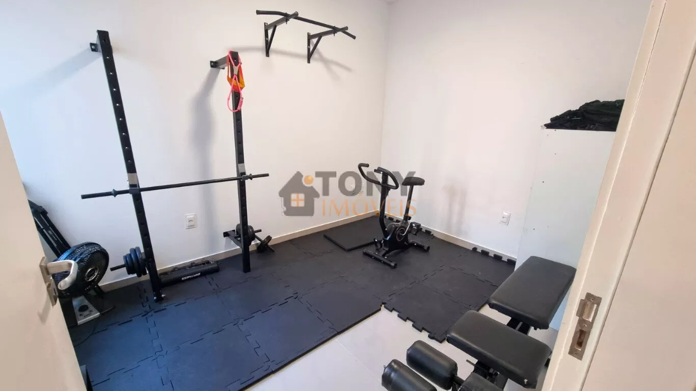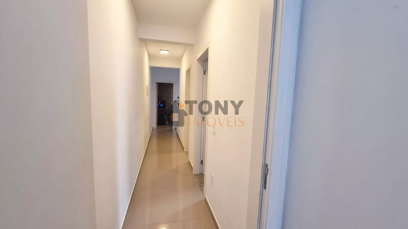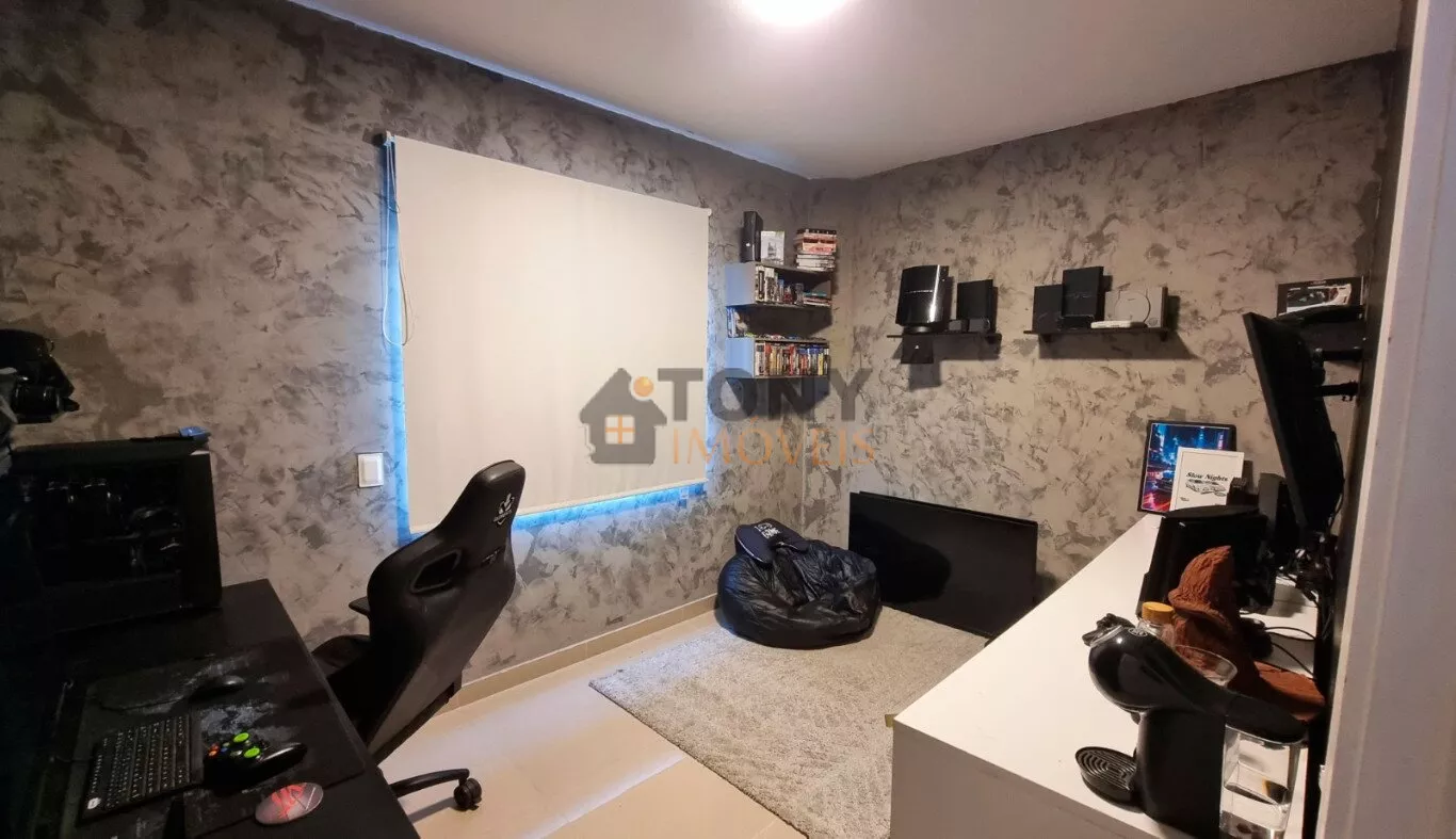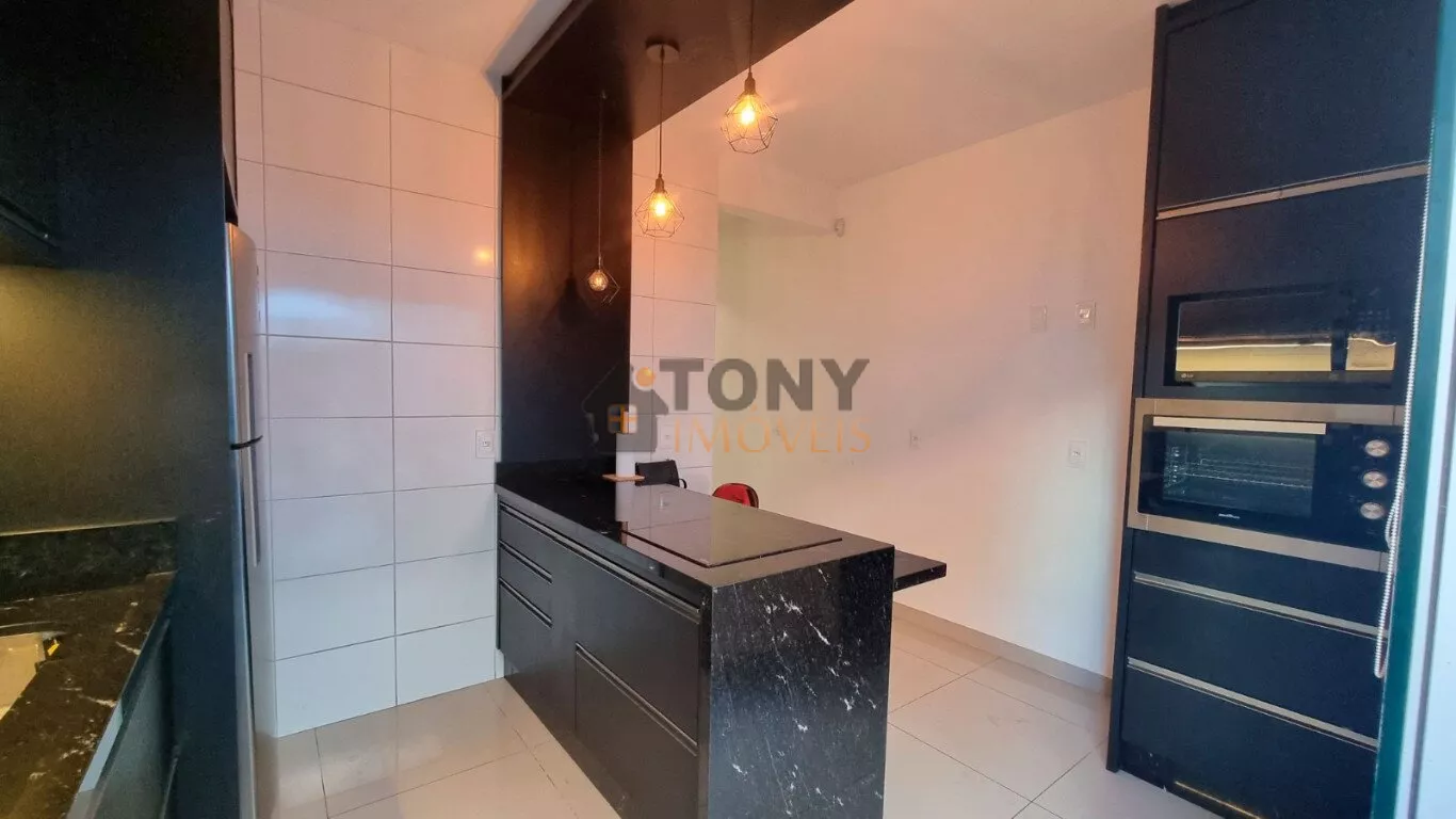 Um sobrado com 3 quartos, 2 banheiros, espaço amplo na sala, área de serviço nos fundos além de um quintal espaçoso com churrasqueira e uma garagem com espaço para 2 carros, móveis planejados na cozinha.