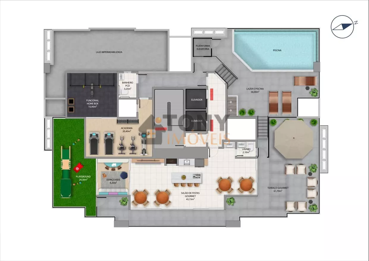 🌴 Área de lazer completa no rooftop: