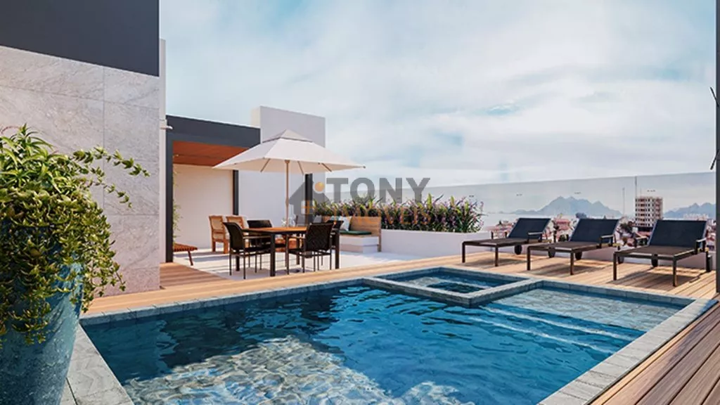 Piscina no ático com vista panorâmica.